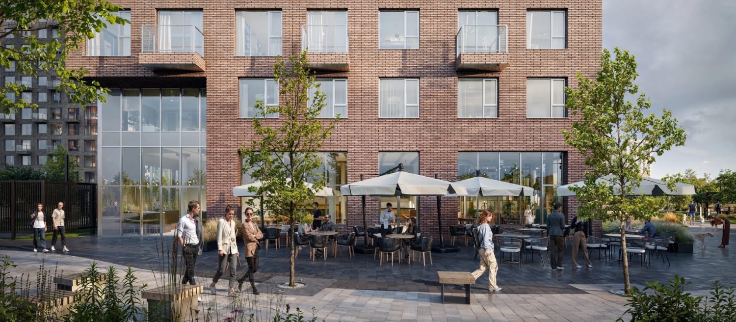 Фасады выполнены из фактурного кирпича, который напоминает текстуру природных материалов. Вставки из стекла создают эффект невесомости, а чёткие геометрические линии и строгие формы корпусов придают кварталу современный и стильный вид.