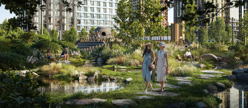 Взрослые смогут отдохнуть в дождевом саду — это удивительное место, где после дождя появляются маленькие живописные озерца. Для спорта — уличные тренажёры, площадки для командных игр, столы для пинг-понга и шахмат. Владельцы собак оценят место для прогулок с питомцем.