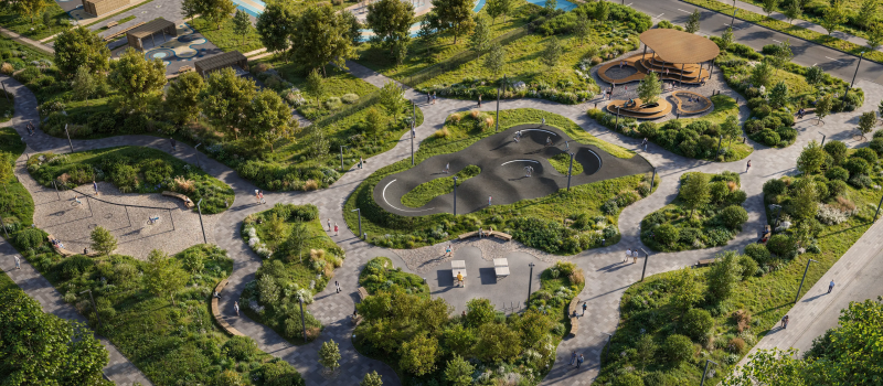 А специально для подростков мы спроектировали уникальное пространство для отдыха — памп-трек для катания, большой навес, амфитеатр и сетки для отдыха, где они смогут собираться вместе в любую погоду.