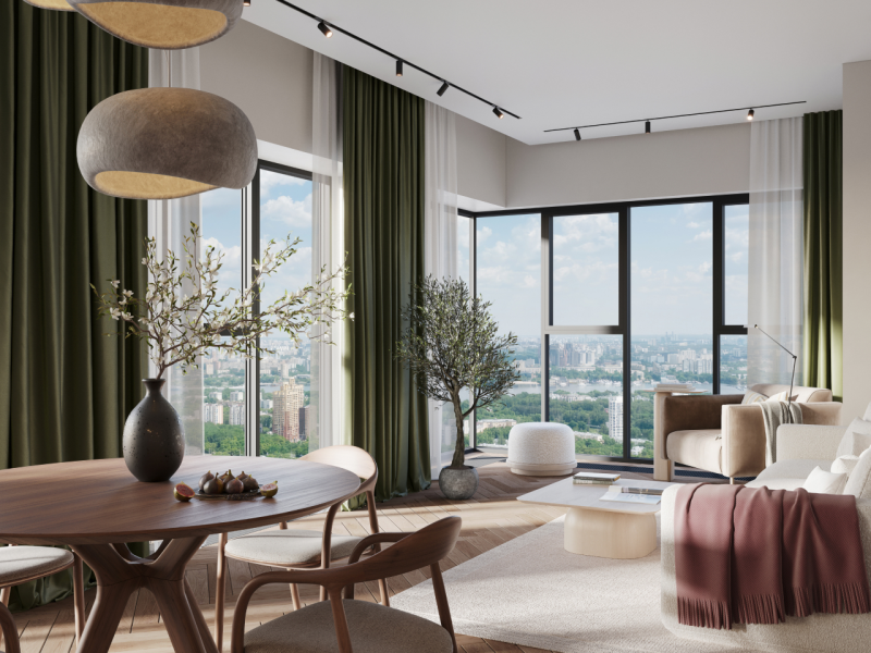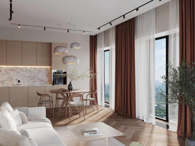 • Объединенные кухни-гостиные с полноценной обеденной зоной и диванной группой.