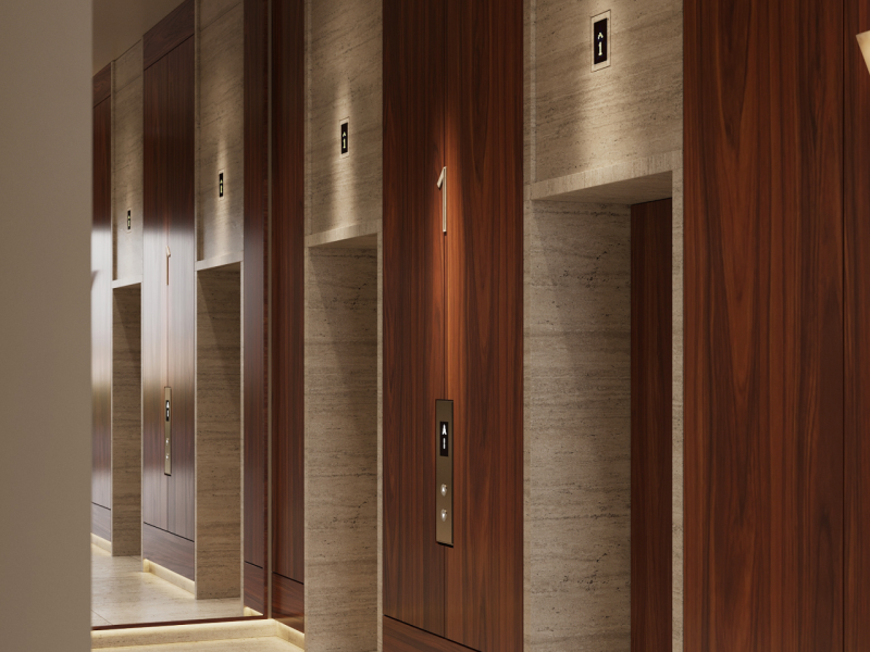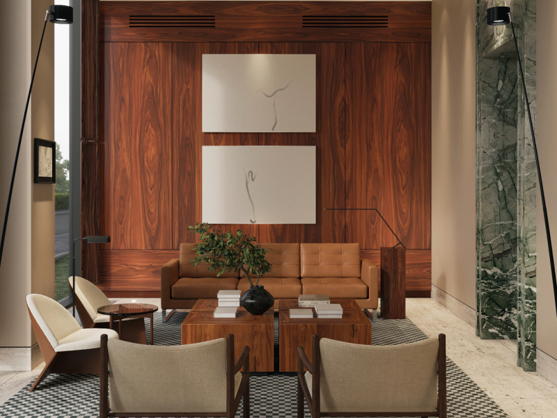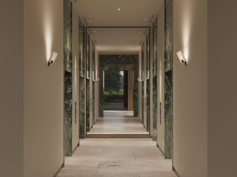 • Натуральные материалы отделки: дерево, шпон, мрамор, зеленый мрамор, травертин
