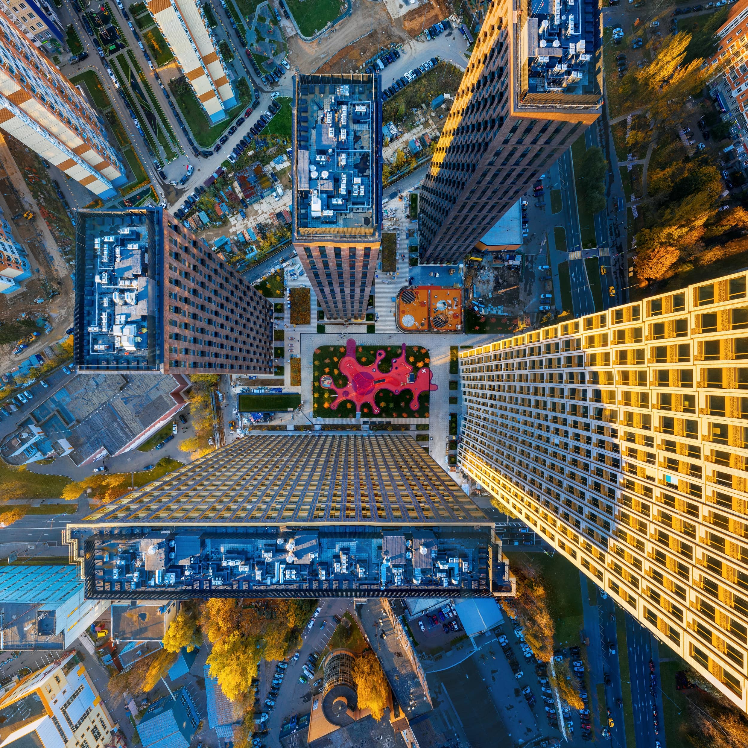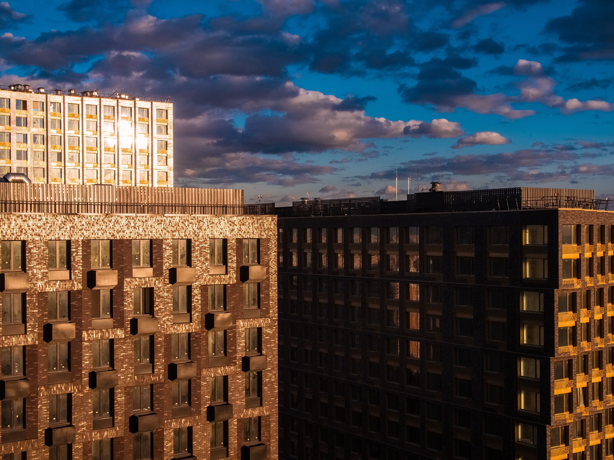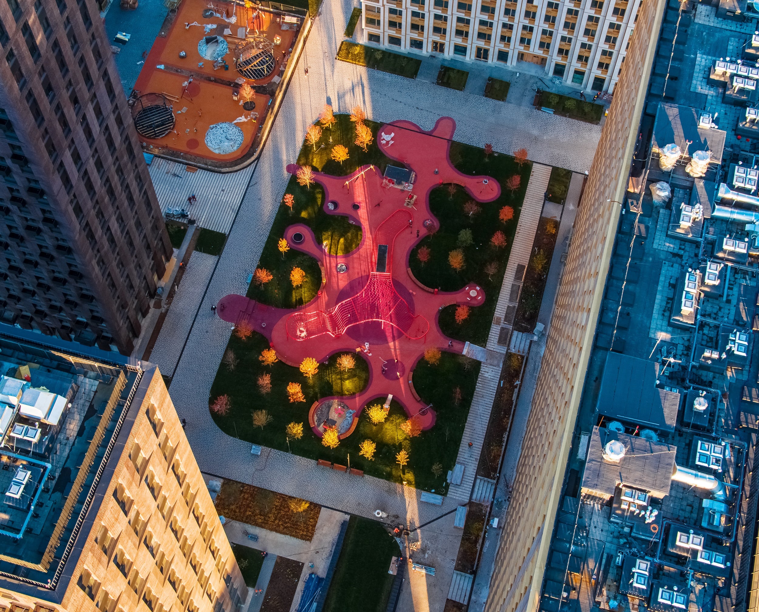 Фасады корпусов окрашены в цвета с переходом от светло-коричневого к терракотовому. Панорамное и угловое остекление гарантирует жильцам отличный обзор. Дизайнерское бюро Gillespies разработало концепцию благоустройства придомовой территории, которая будет безопасна и закрыта для машин.