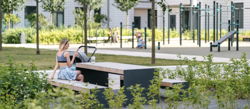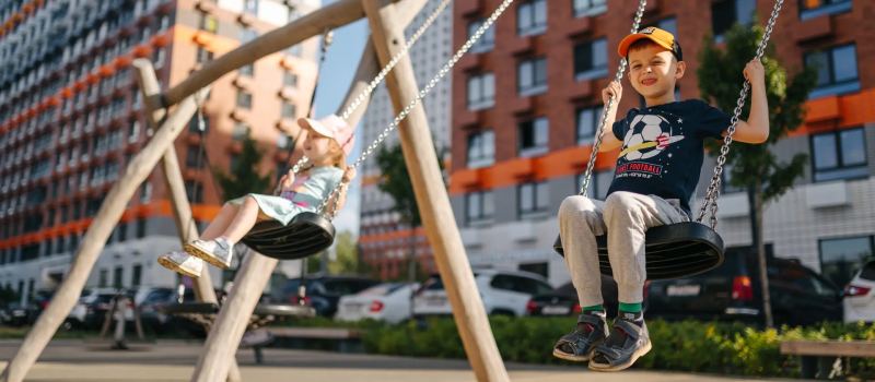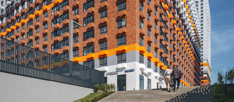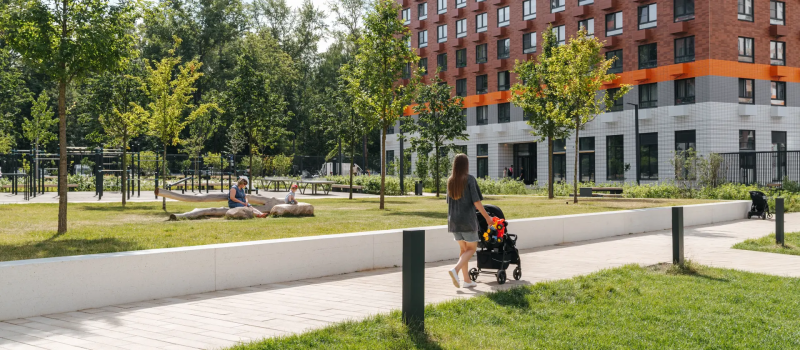 Просторные подъезды с высокими потолками, витражным остеклением и современным дизайном имеют два входа: со двора и улицы. Входы расположены на уровне земли, без ступеней и пандусов. На первых этажах разместятся магазины и предприятия сферы услуг, а в зелёных дворах-парках без автомобилей будут обустроены детские площадки и места для отдыха.