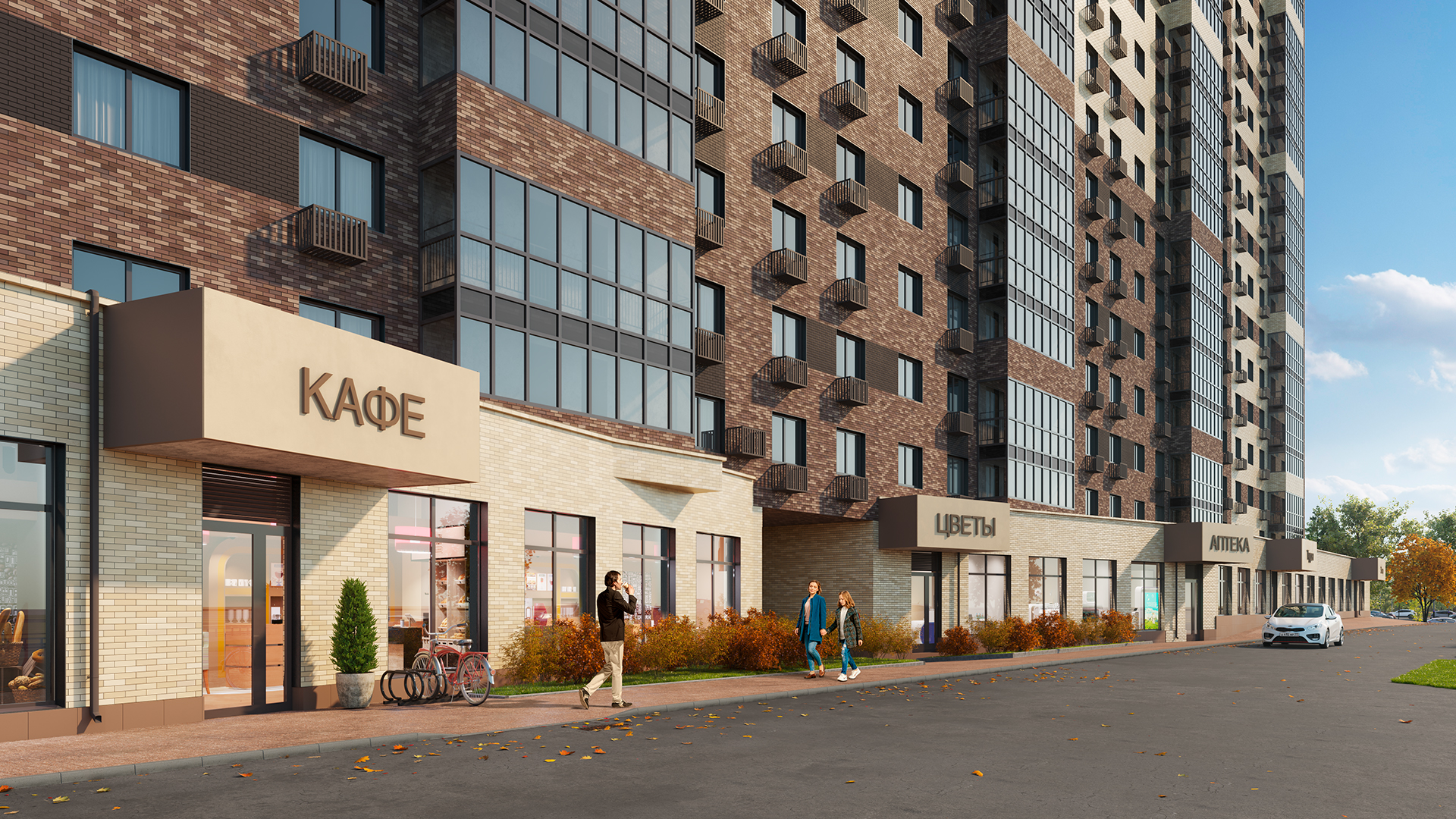 Первые этажи жилых зданий отведены под коммерческую недвижимость. Здесь будут размещены торговые точки, салоны красоты, кафе — все, что необходимо современному человеку для комфортной жизни.