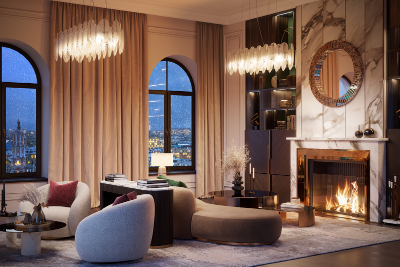 В доме представлены роскошные квартиры с дровяными каминами и высокими потолками от 3,9 до 5,4 м.