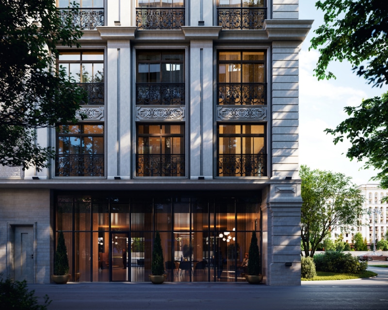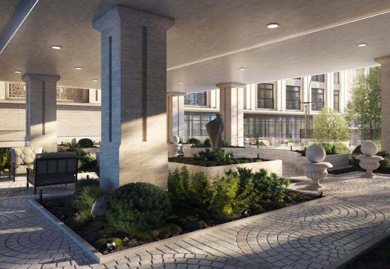 Пространство двора будет закрыто ажурной кованой оградой, вечерняя подсветка дома в обрамлении зелени дополнит атмосферу уюта и камерности. Отличительная особенность проекта — приватное патио с тенелюбивыми растениями и арт-объектами. В лобби есть лаунж-зона с камином и мягкими креслами, а также отдельная зона для собственных мероприятий резидентов — деловых или личных. Здесь удобно провести переговоры, организовать фуршет или коктейльный вечер.