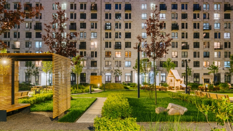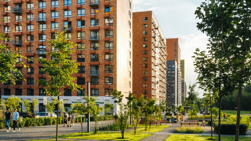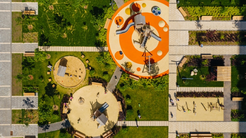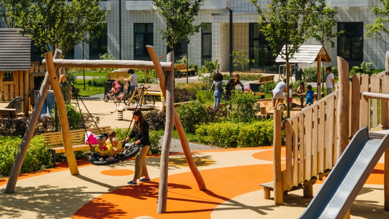 В жилом квартале уже открыты школа и детский сад. Со временем мы построим здесь ещё одну школу, детский сад и надземные паркинги. На первых этажах домов работают магазины и кафе. Рядом с домами — закрытые от посторонних дворы-парки с зелёными газонами, большими деревьями, местами для активного и спокойного отдыха. Вдоль всего квартала проходит пешеходный бульвар — любимое место прогулок жителей.