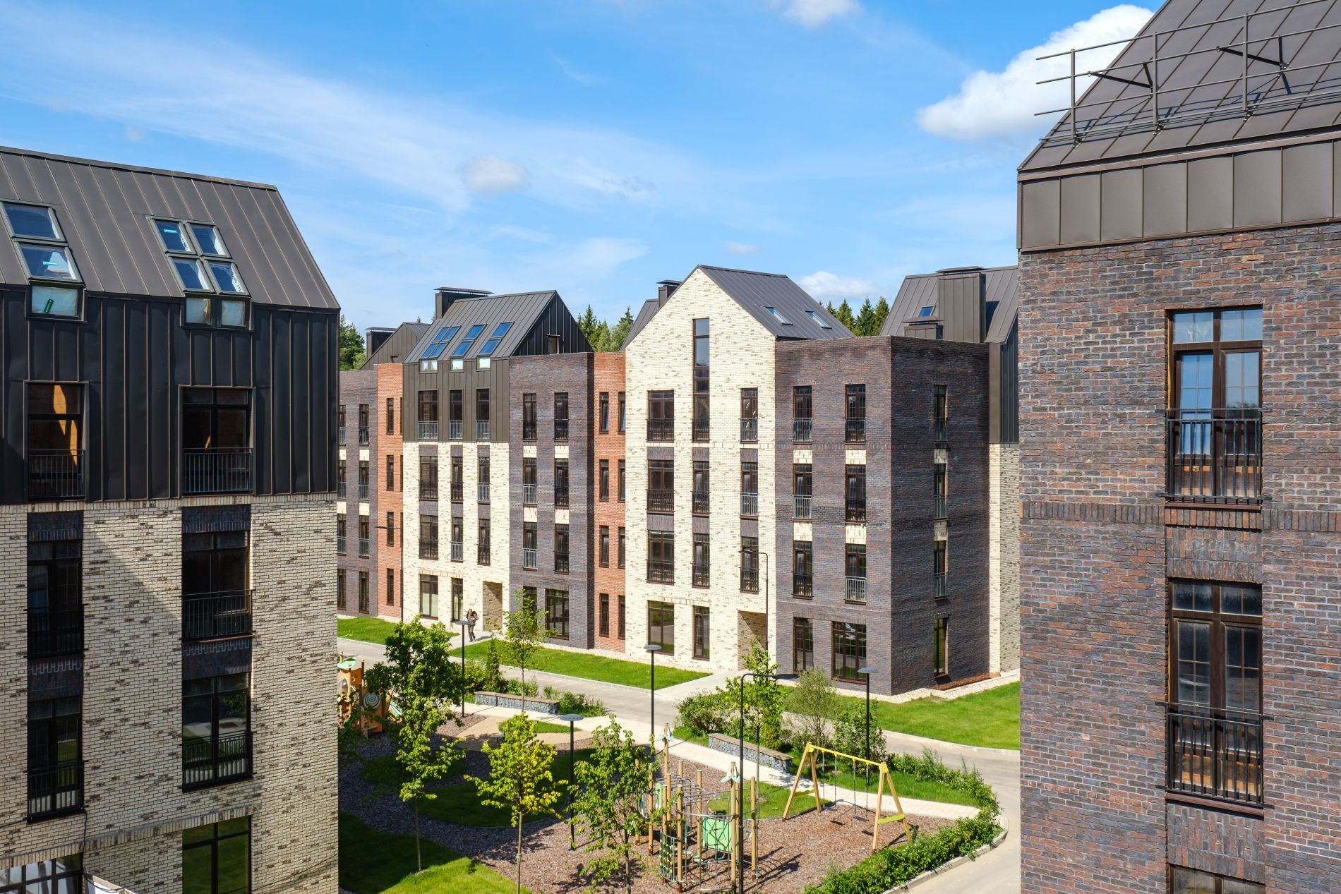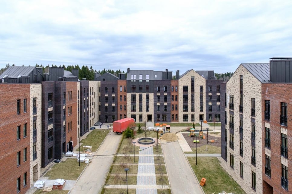 При строительстве зданий использованы безопасные материалы от европейских производителей: австрийские керамические блоки Wienerberger, бельгийский облицовочный кирпич ручной формовки, цементно-песчаная черепица BRAAS. Дворы малоэтажных корпусов оборудованы детскими площадками, закрыты от въезда автотранспорта и представляют собой уютные полузамкнутые пространства. Каждый из них благоустроен в стиле определенного музыкального джазового инструмента.