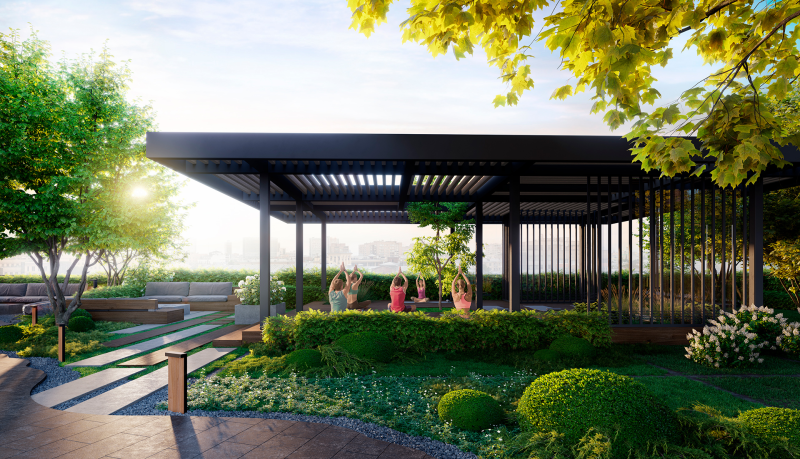 Ландшафтные архитекторы бюро А4 продумали благоустройство квартала как систему взаимосвязанных пространств для отдыха и вдохновения. Уникальное wellness-пространство гармонично вписано в городской ландшафт и создает атмосферу уверенности и спокойствия.