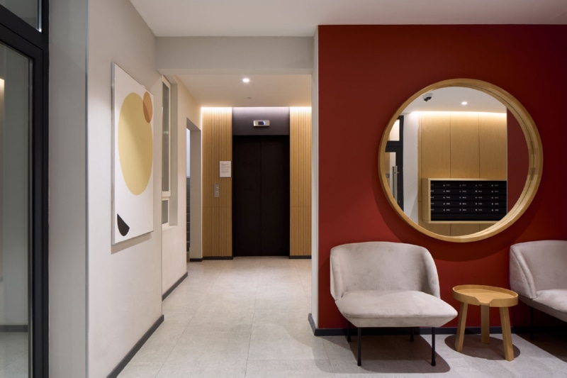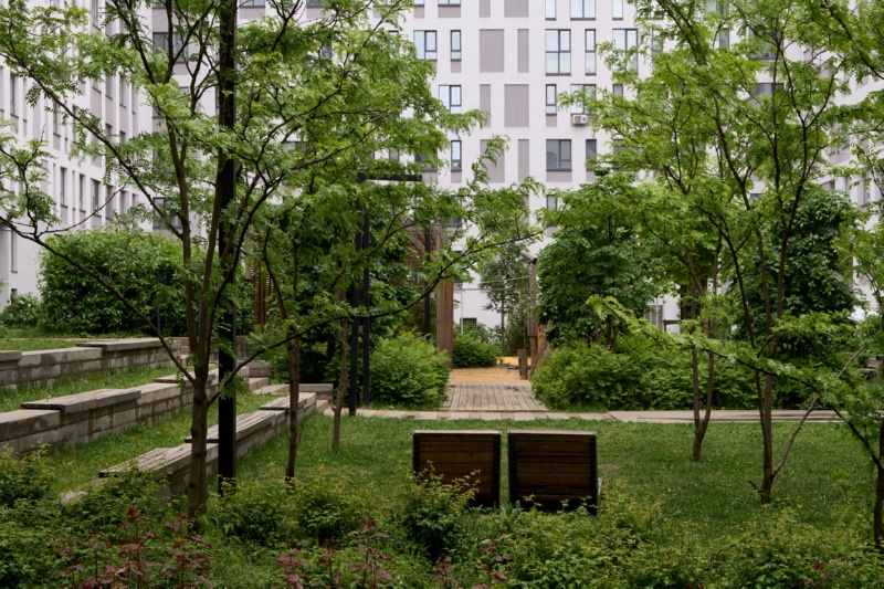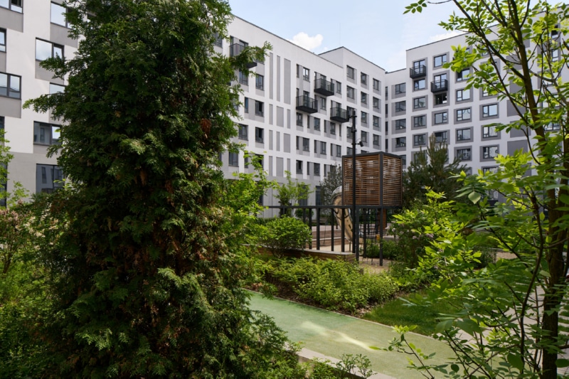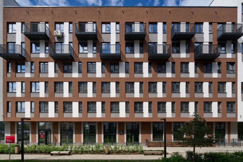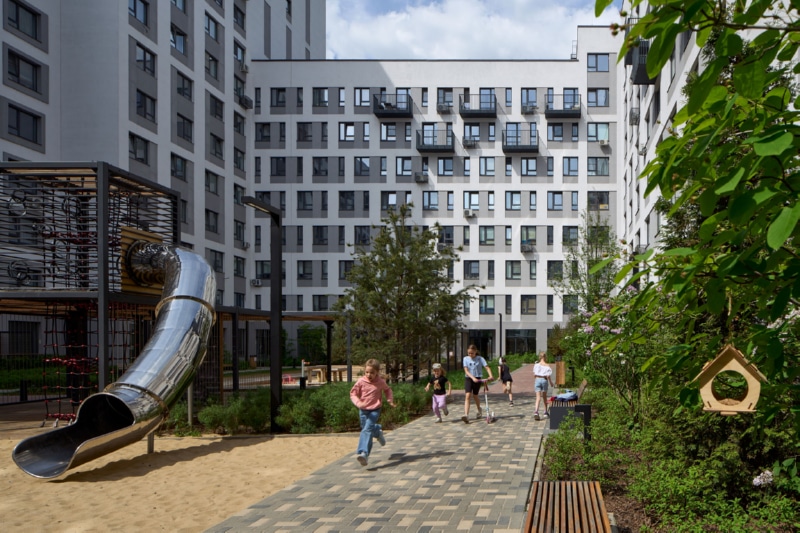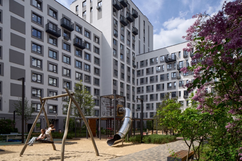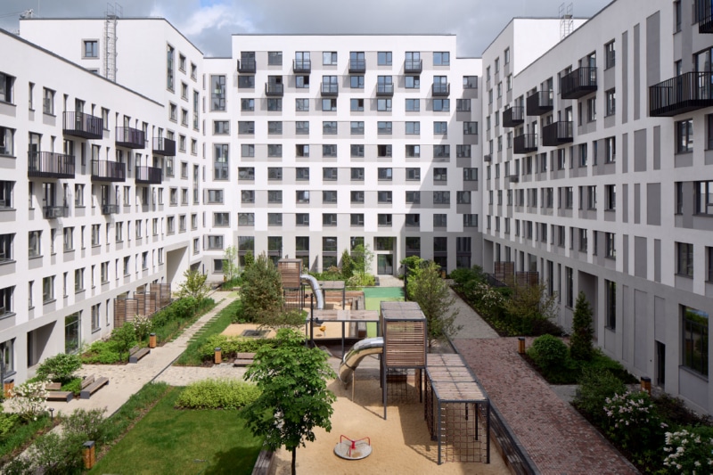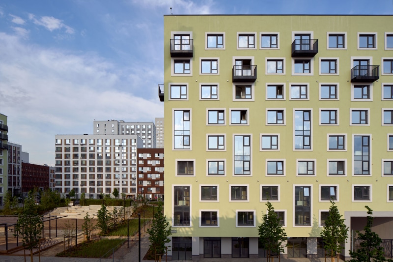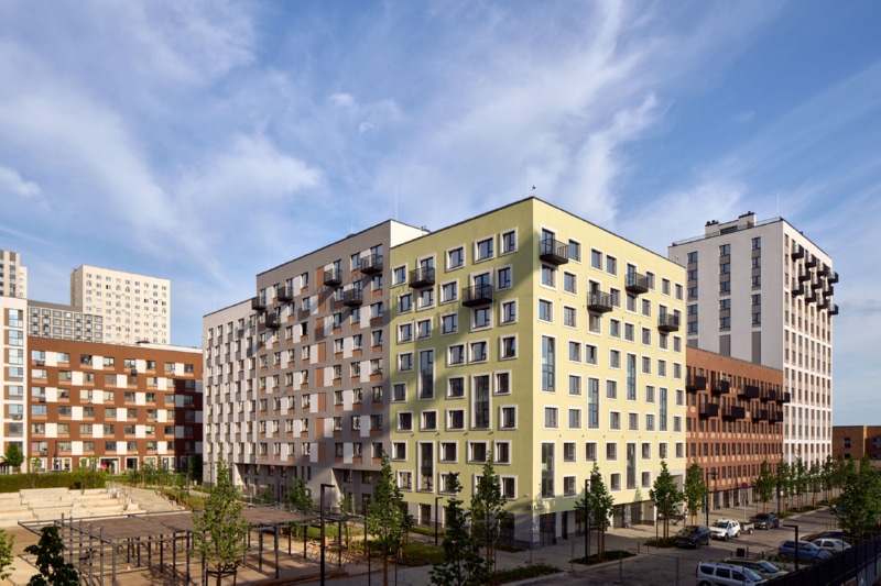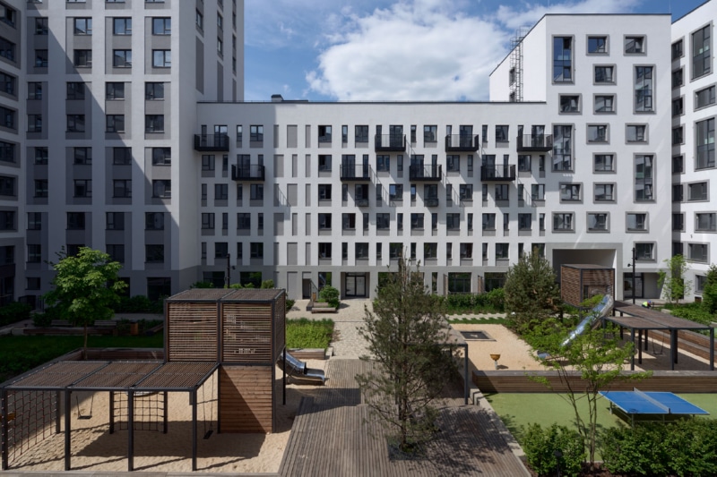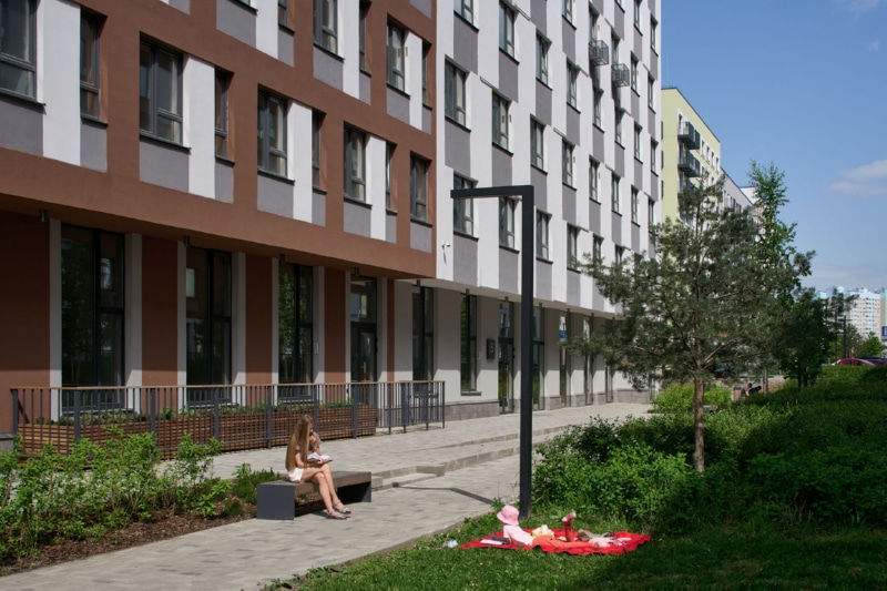 Фасад здания оформлен мокрой штукатуркой пяти цветов и стеновыми панелями. На первых этажах спроектированы квартиры с собственными террасами ー это небольшие огороженные участки двора, принадлежащие жителям. Террасы позволяют разместить в квартирах окна в пол. Предусмотрены различные типы особенных планировок, например, двухуровневые квартиры со вторым светом. В каждом доме расположены кладовые помещения. Гостевые парковочные места находятся по периметру кварталов.