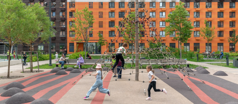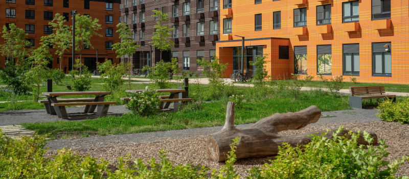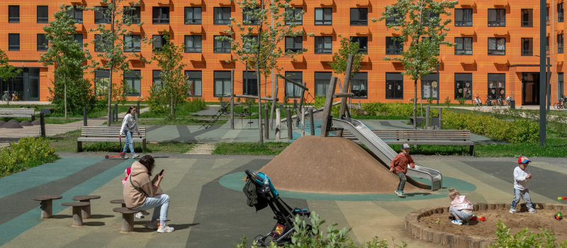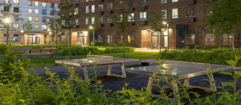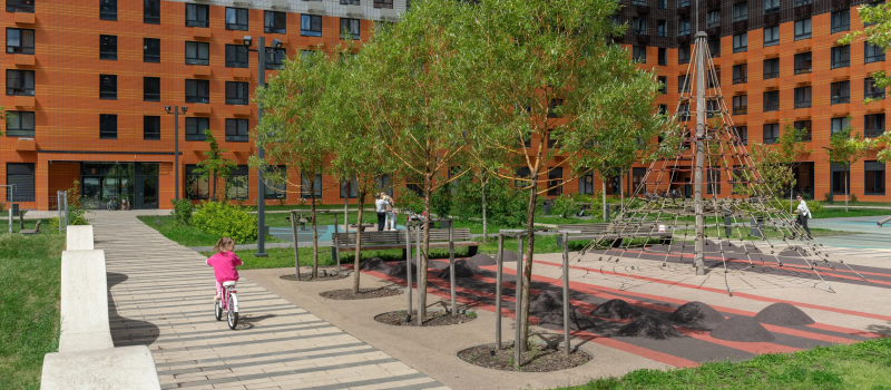 В «Полярную 25» входит десять жилых корпусов, два детских сада, школа, подземный многоуровневый паркинг. Это уютный жилой квартал, где есть всё для комфортной жизни. Из каждого дома есть выход в закрытый двор-парк, где не ездят машины и не гуляют случайные прохожие. Это спокойное место для отдыха, чтения книги и занятий йогой. Во дворе есть спортивные площадки с тренажерами — удобно выполнять упражнения на свежем воздухе прямо рядом с домом. А для детей мы построили игровые площадки из натуральных и безопасных материалов.