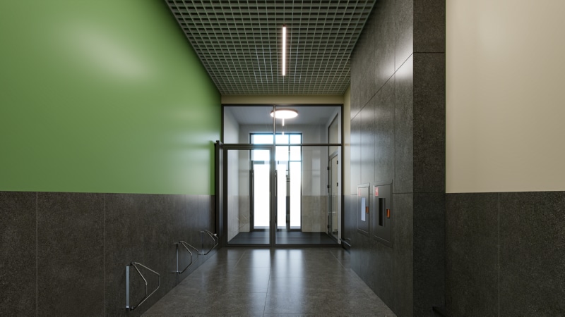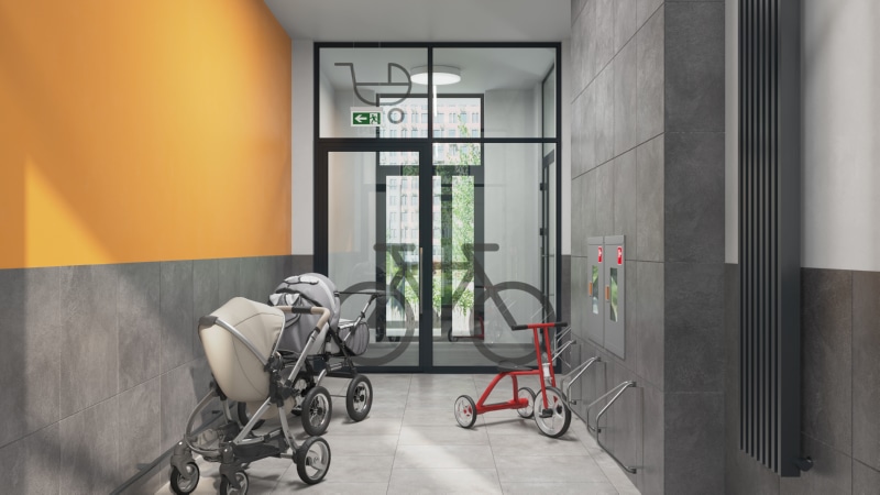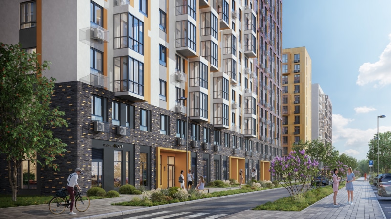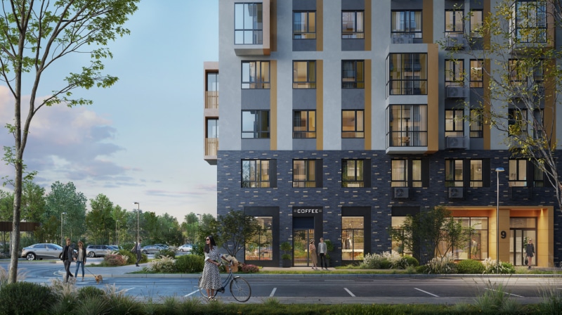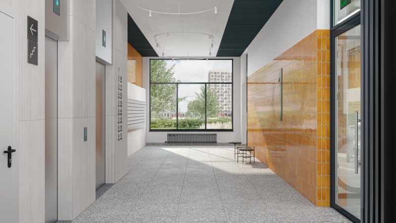 Входные группы с панорамным остеклением расположены на уровне земли, обеспечивая таким образом безбарьерное пространство для родителей с колясками, инвалидов и велосипедистов. В каждом подъезде установлены современные лифты, предусмотрены кладовые помещения, места для хранения велосипедов, колясок и комната консьержа. На первых этажах будут располагаться объекты внутренней инфраструктуры.