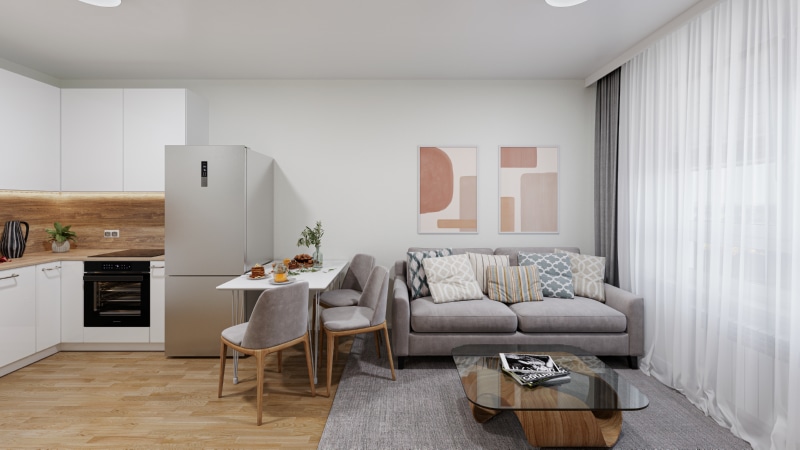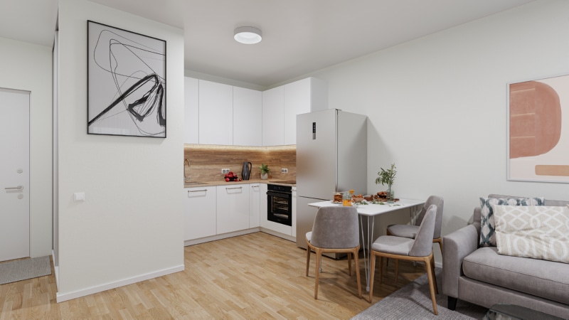 Недвижимость будет сдана с отделкой «под ключ», то есть установлены межкомнатные двери, сантехника, проведены коммуникации, уложен ламинат и поклеены обои под окраску. Дизайн интерьера будет выполнен в нейтральных тонах, жильцам останется лишь расставить акценты с помощью мебели, аксессуаров и текстиля. Квартиры оборудуют техникой и кухонной мебелью в одной из 4 комплектаций, которую выберут будущие владельцы.