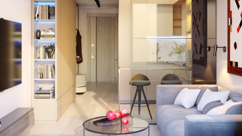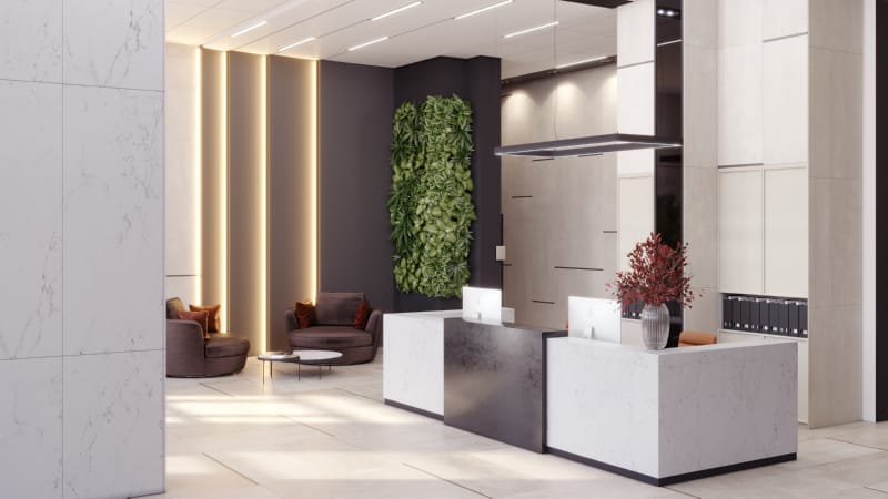 Вход в подъезд расположен на уровне земли. В стильном лобби с мягкой зоной встречает консьерж-сервис, который проводит ваших гостей, курьера и примет доставку с маркетплейса.