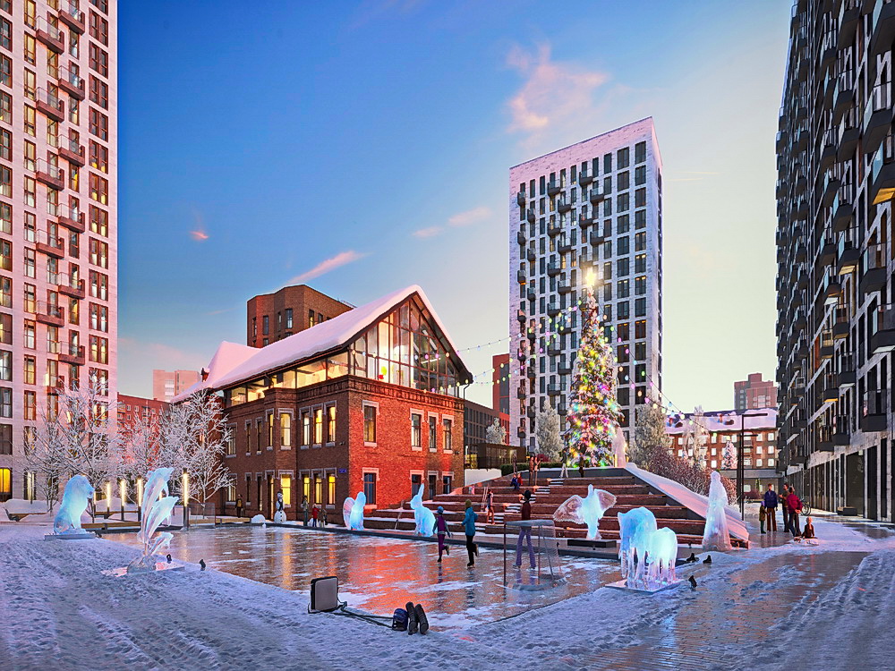 Центральная площадь с фонтаном концептуально объединяет жилую территорию с зеленой прогулочной зоной, зданиями торгового комплекса и фитнес-центра. На внутренней территории оборудованы пешеходные дорожки со скамейками и арт-композициями, создающими уютную камерную атмосферу.