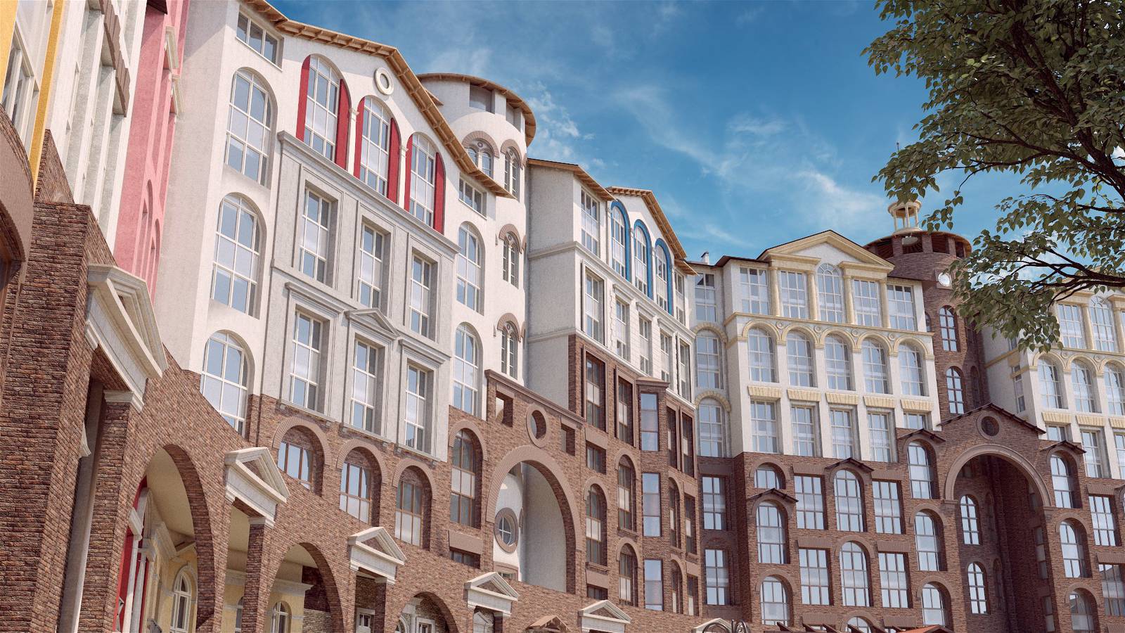 На верхнем уровне разместятся благоустроенные дворы без машин, приватная территория для жителей, детские игровые и спортивные площадки, монументальные римские скамьи, увитые виноградом колонны, античные беседки, прогулочные аллеи, центральная площадь с фонтаном и стеллой. На нижнем уровне – коммерческая часть, подземные паркинги и проезды.