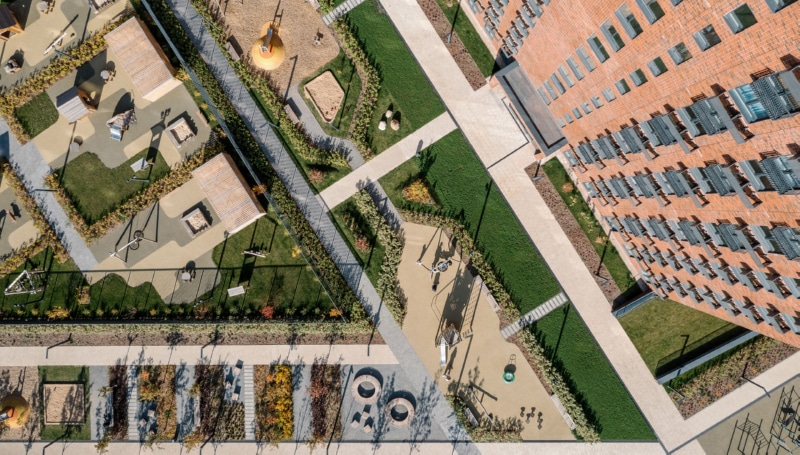 Проект включает в себя 15 жилых домов, три детских сада, два из которых уже открыто, школу, поликлинику и подземные паркинги. Корпуса имеют просторные подъезды с высокими потолками, витражным остеклением, современным дизайном и двумя входами: со двора и улицы. Входы расположены на уровне земли, без ступеней и пандусов. На первых этажах разместятся магазины и предприятия сферы услуг.