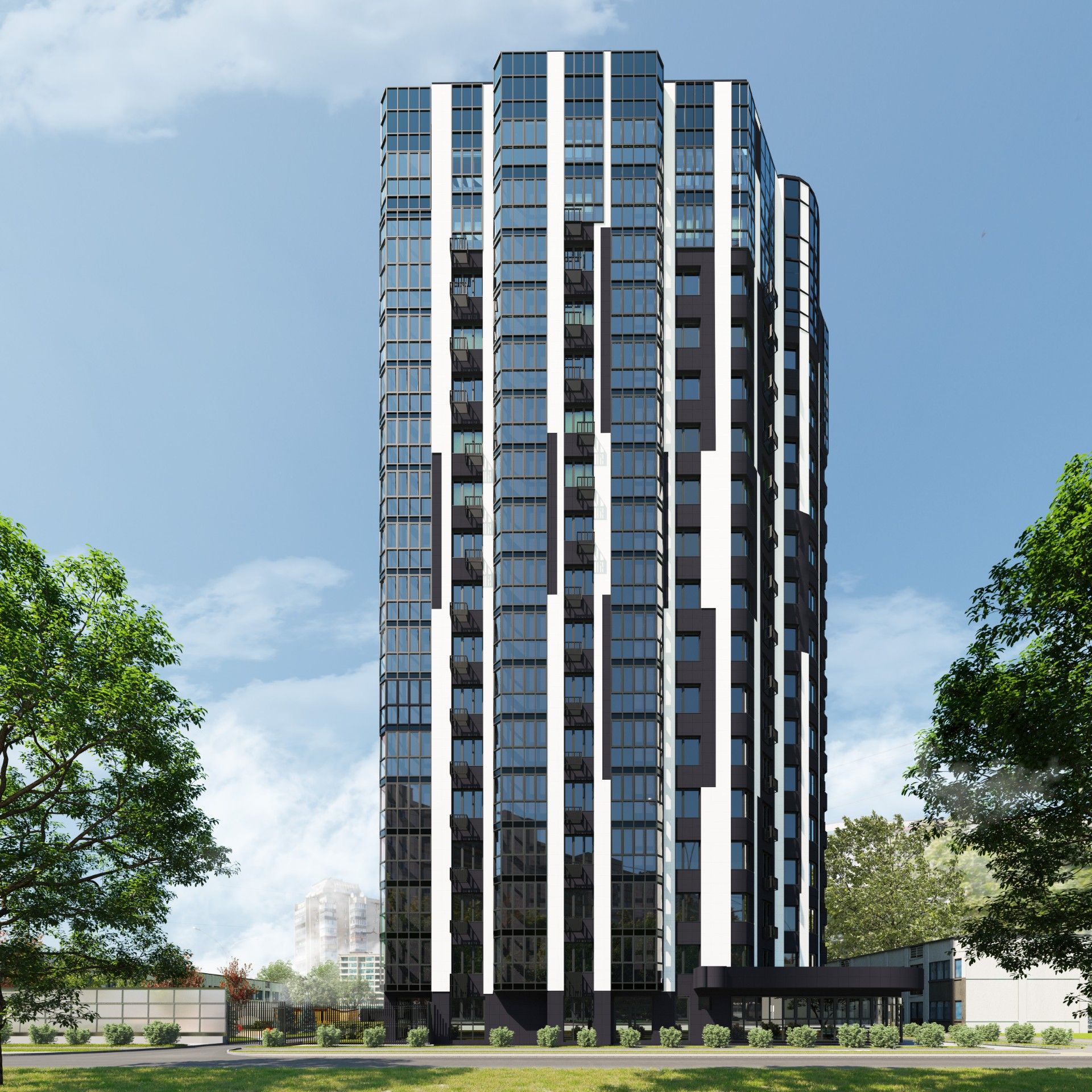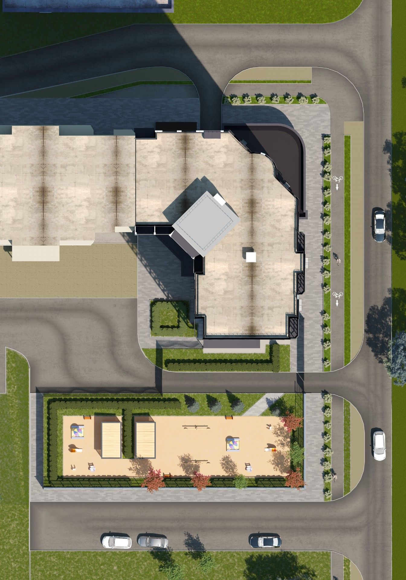 В рамках проекта предусмотрено обустройство детской игровой площадки, спортивной площадки и зон отдыха. На первом этаже с торца нового здания будет расположена территория детского сада с прогулочными площадками и теневыми навесами. Ландшафтное озеленение включает посадку кустарников, газонов, хвойных и лиственных деревьев.