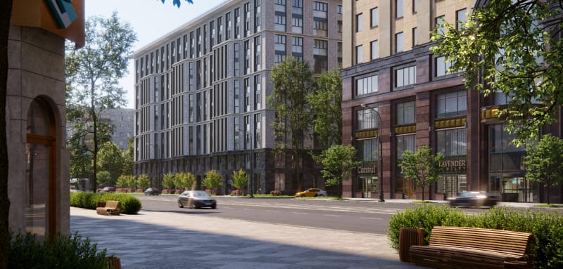 На территории комплекса — площадь для прогулок. Продуманный ландшафтный дизайн и подсветка создают уникальное пространство, где хочется расслабиться в конце рабочего дня.