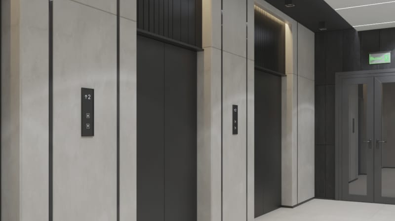 На этаже — 7 тихих грузопассажирских лифтов от бренда KLEEMANN. Их строгий дизайн гармонично вписывается в общую концепцию.