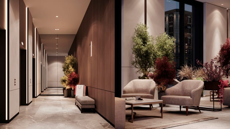 На входе вас встречает стойка ресепшен с консьержем. Теплую атмосферу дизайнерских лобби создают натуральные материалы естественных оттенков, тщательно подобранные растения и предметы декора.