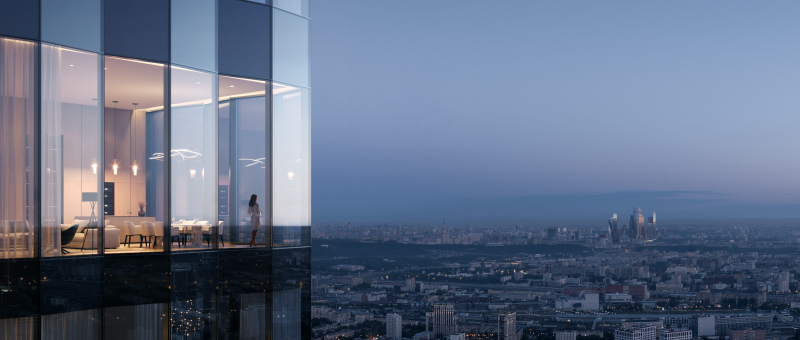 Панорамный лаунж на высоте 140 метров — место для уединения, разговоров с близкими и друзьями, рефлексии и прогулок в плохую погоду. Из больших окон открываются впечатляющие виды на Москву.