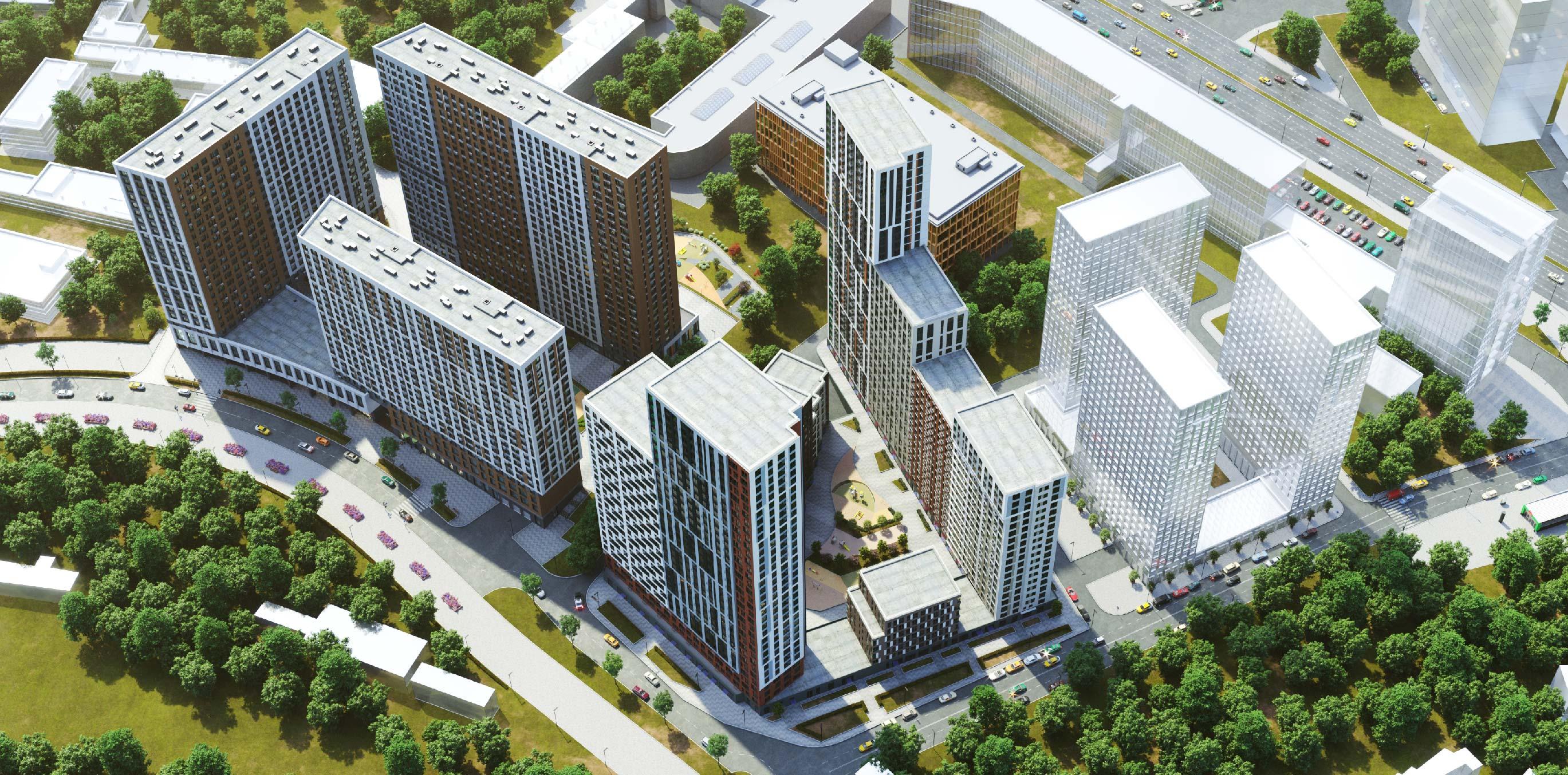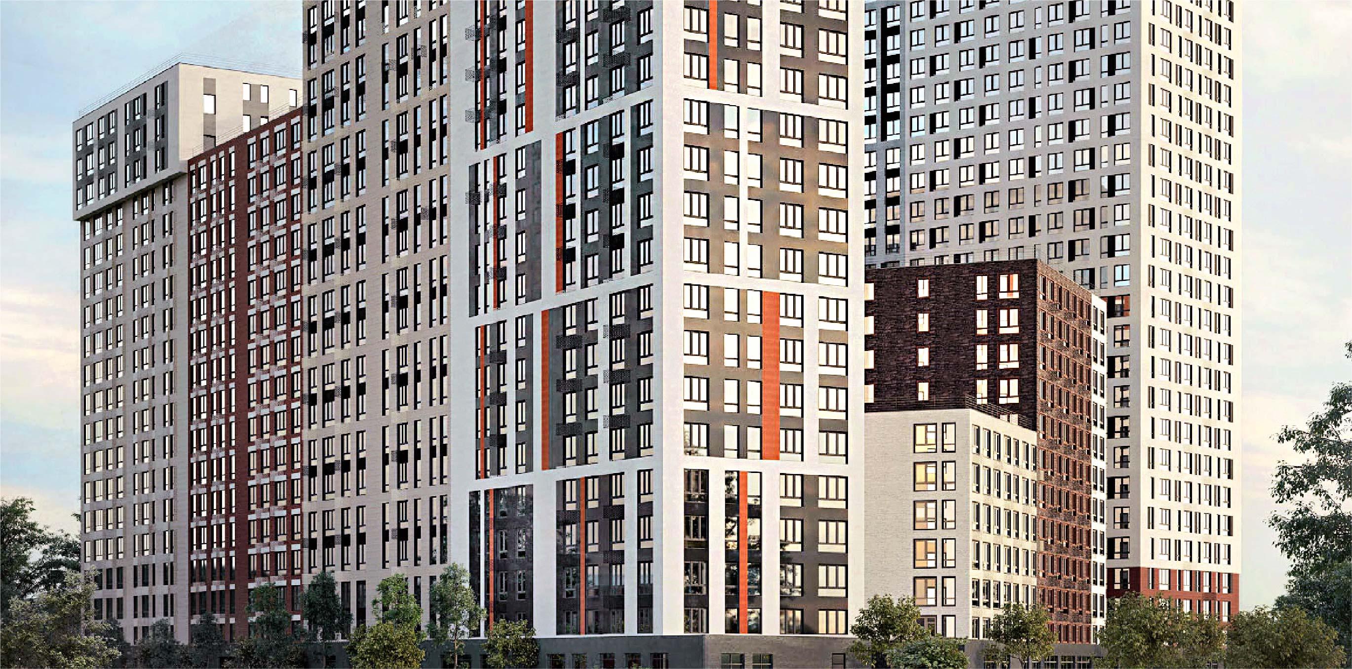 Четыре монолитных дома разной этажности от 5 до 33 этажей, которые объединены закрытым благоустроенным двором без машин. Дома образуют единый архитектурный ансамбль с жилым комплексом «Тринити», который находится рядом.
