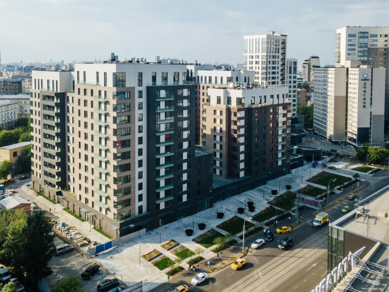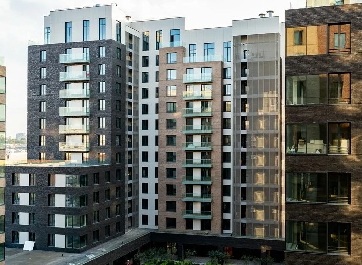 Шестисекционный дом бизнес-класса имеет переменную этажность – от 10 до 13 этажей. Строительство ведется по проекту британского архитектурного бюро Aukett Swanke. Фасады отделаны клинкерным кирпичом, стеклянными и металлическими панелями.