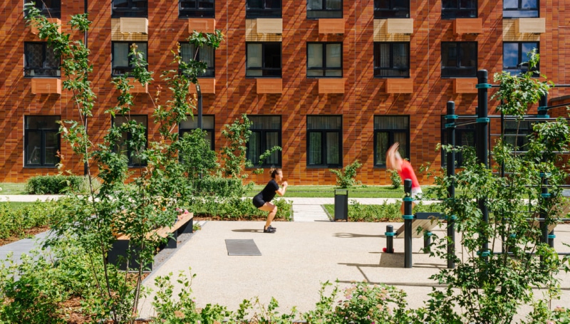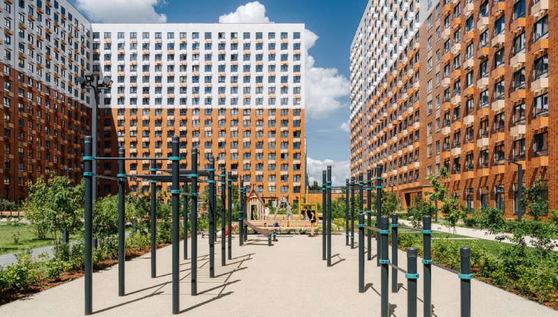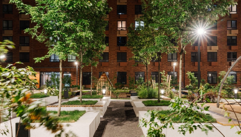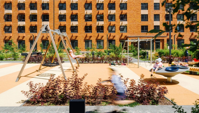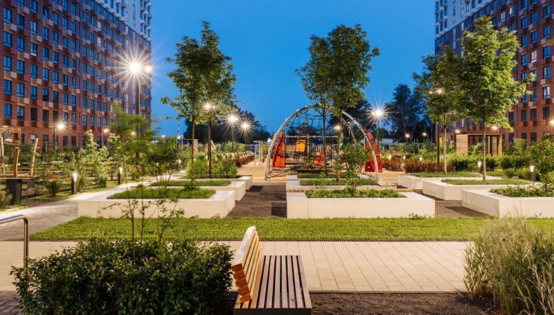 В проекте предусмотрена медленная зона для электросамокатов — с 7 утра до полуночи при въезде на территорию квартала скорость электросамокатов автоматически снижается до 15 км/ч.