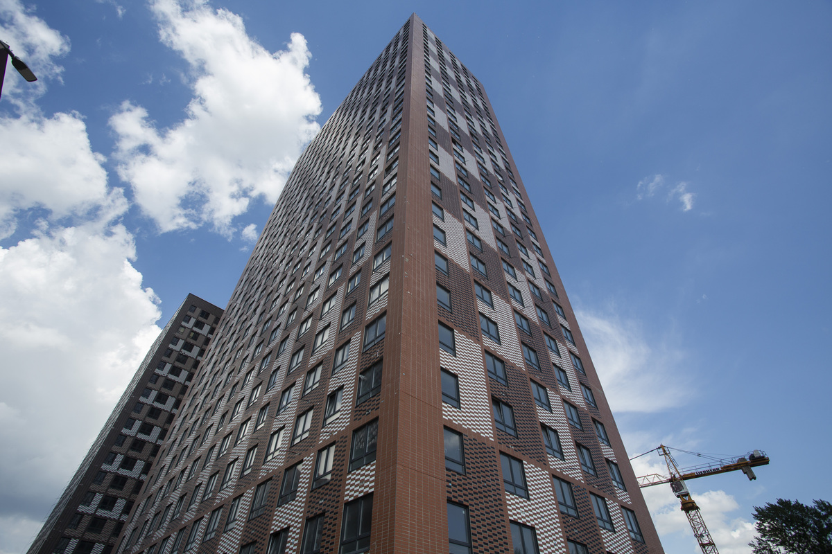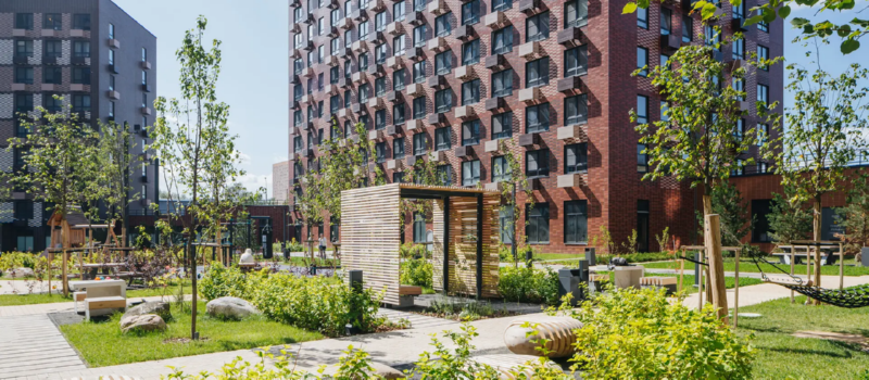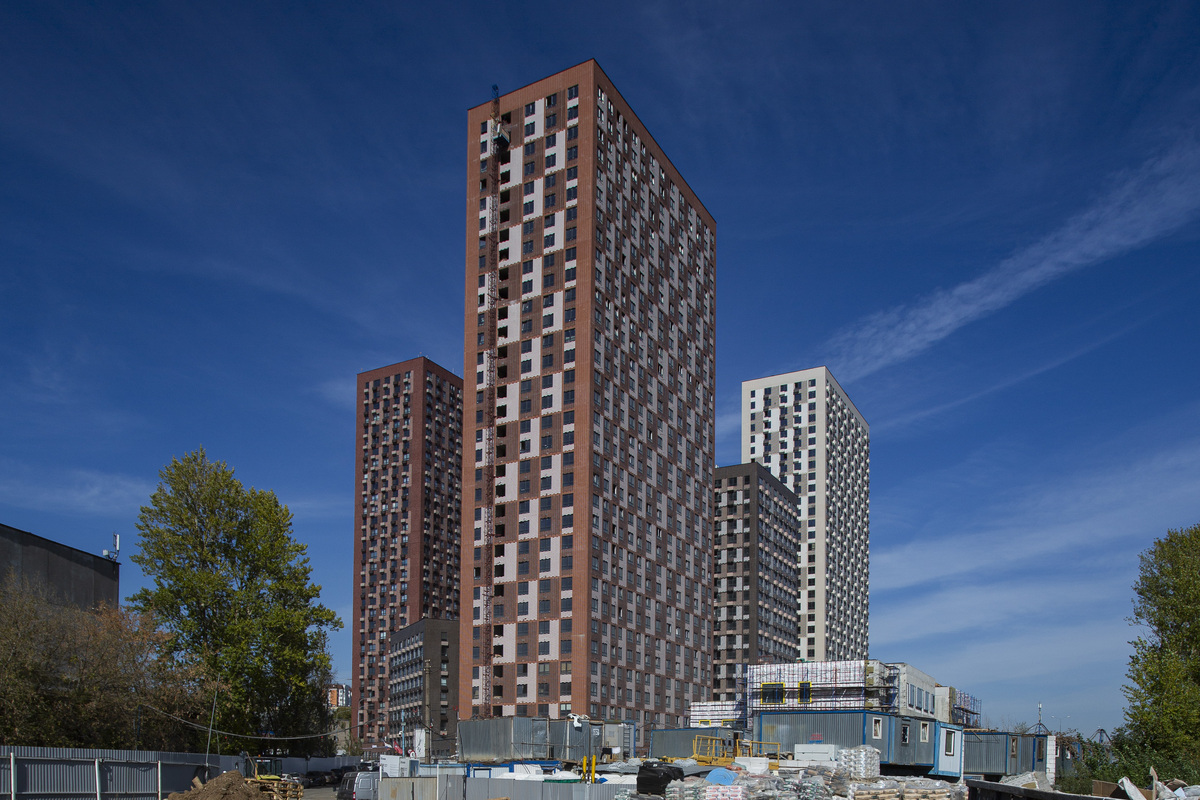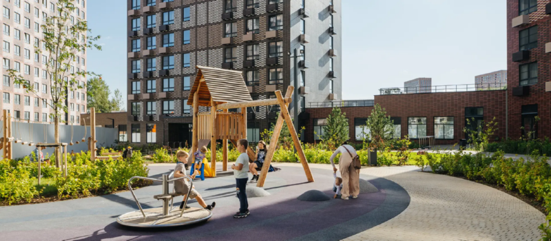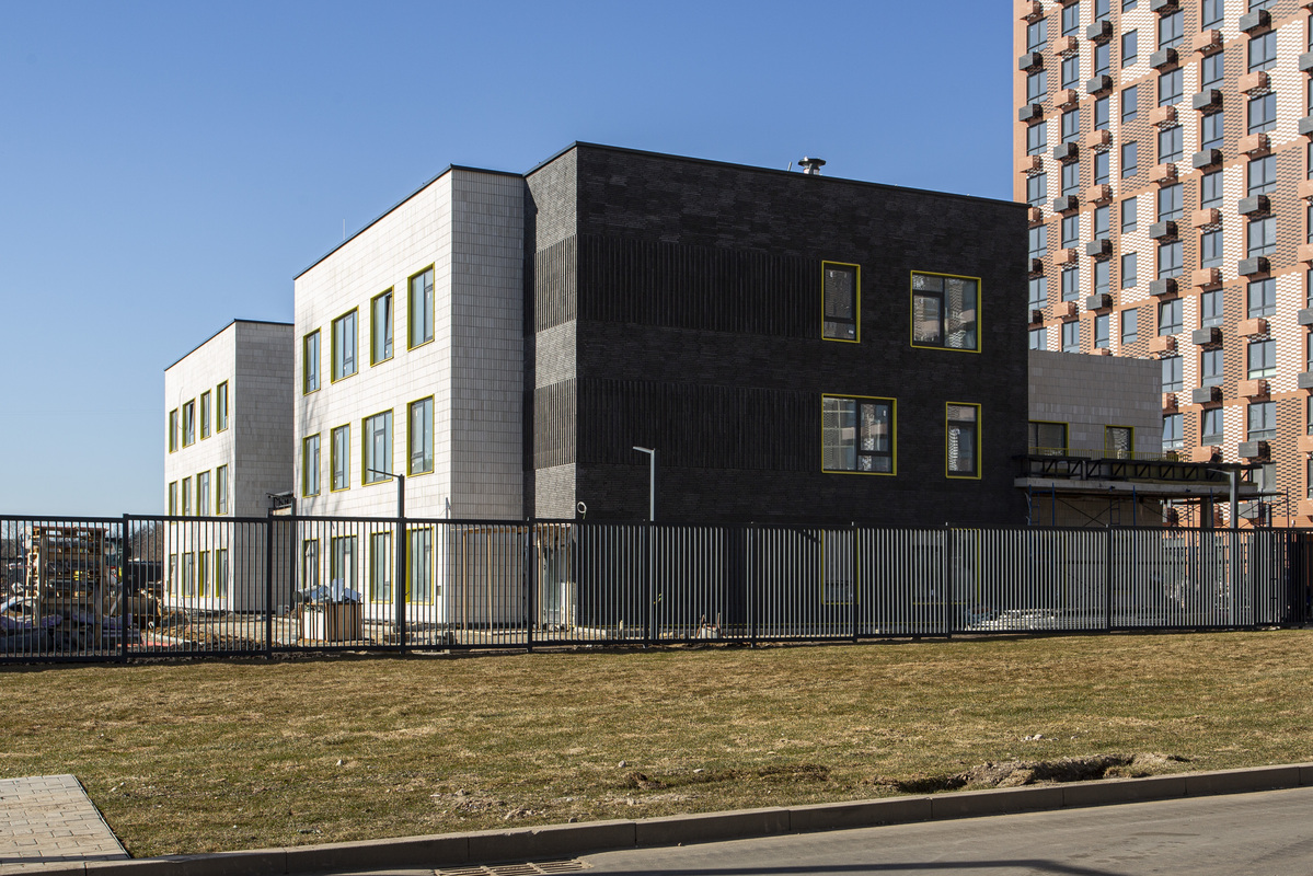 Это небольшой и уютный проект, в котором семь жилых домов, детский сад и два паркинга: плоскостной и подземный. Здания разной высоты — 9, 20 и 33 этажа — размещены так, чтобы пропускать много солнечного света во двор и квартиры.