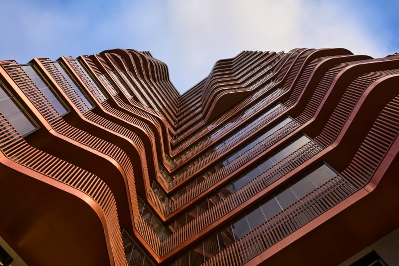 Трендовый облик квартала, ассоциирующийся с колебаниями воды, разработан шведскими архитекторами Semrén & Månsson. Для фасадов использовано сочетание клинкерного кирпича и металлических панелей цвета латуни и меди.