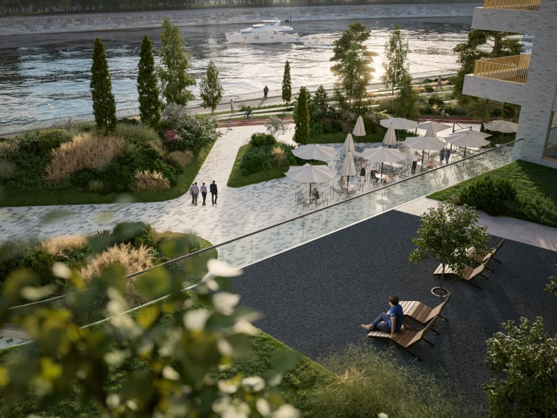 Foriver продуман до мелочей. В нём обустроен двор с газонами и прогулочными аллеями, видовыми площадками для отдыха с деревянными шезлонгами и перголами. Резиденты будут наслаждаться эффектной панорамой Москвы-реки с шестиметровой возвышенности стилобата.