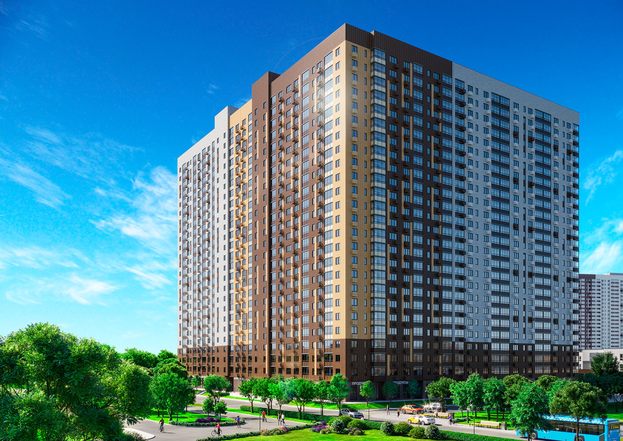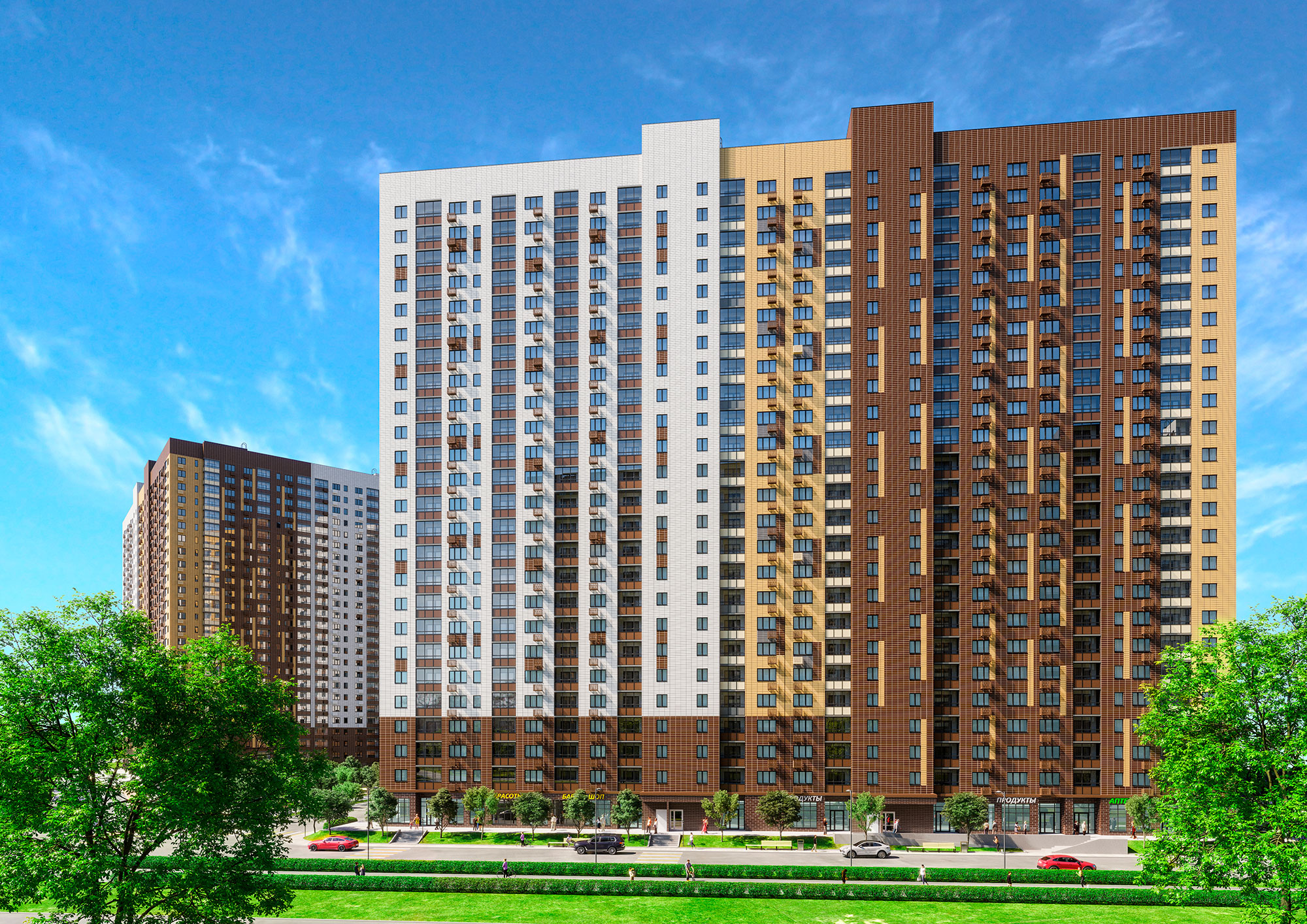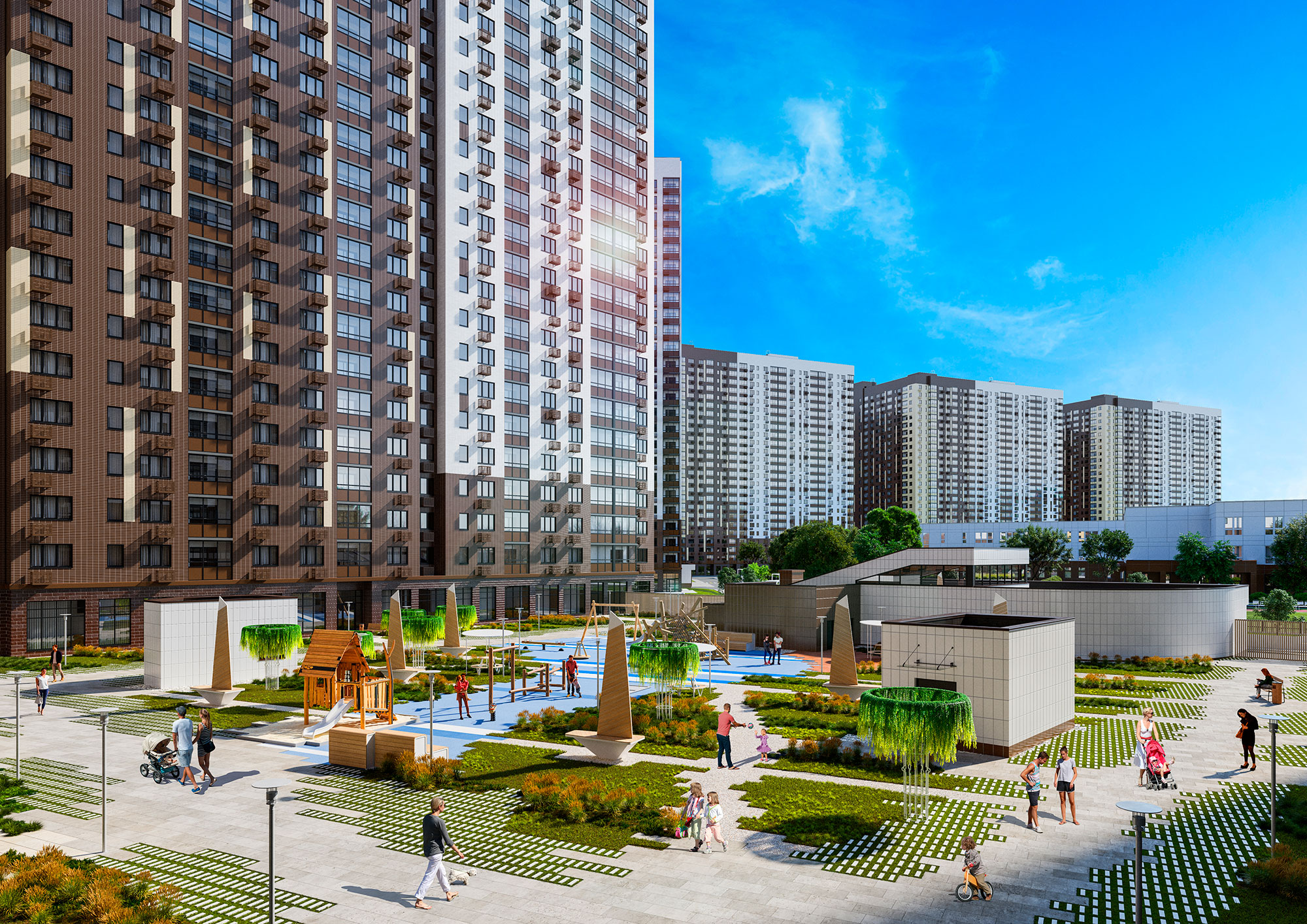 - продуманная инфраструктура: муниципальная школа и детский сад, наземный и подземные паркинги, супермаркеты, кафе, аптеки, пекарни и другие предприятия сферы услуг на первых этажах;
