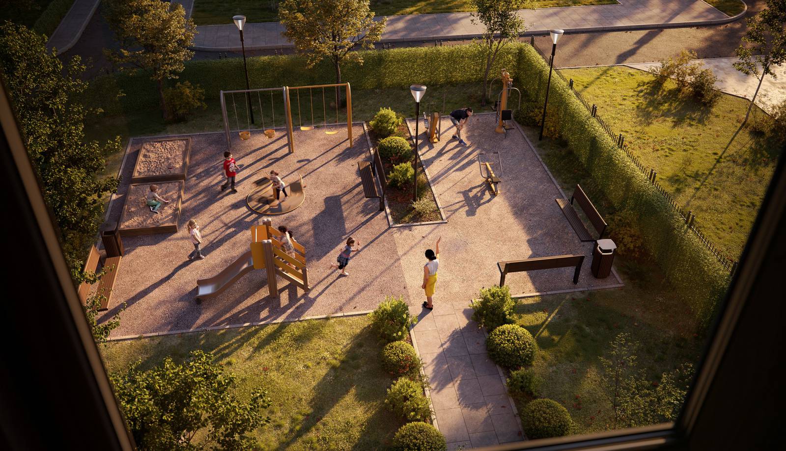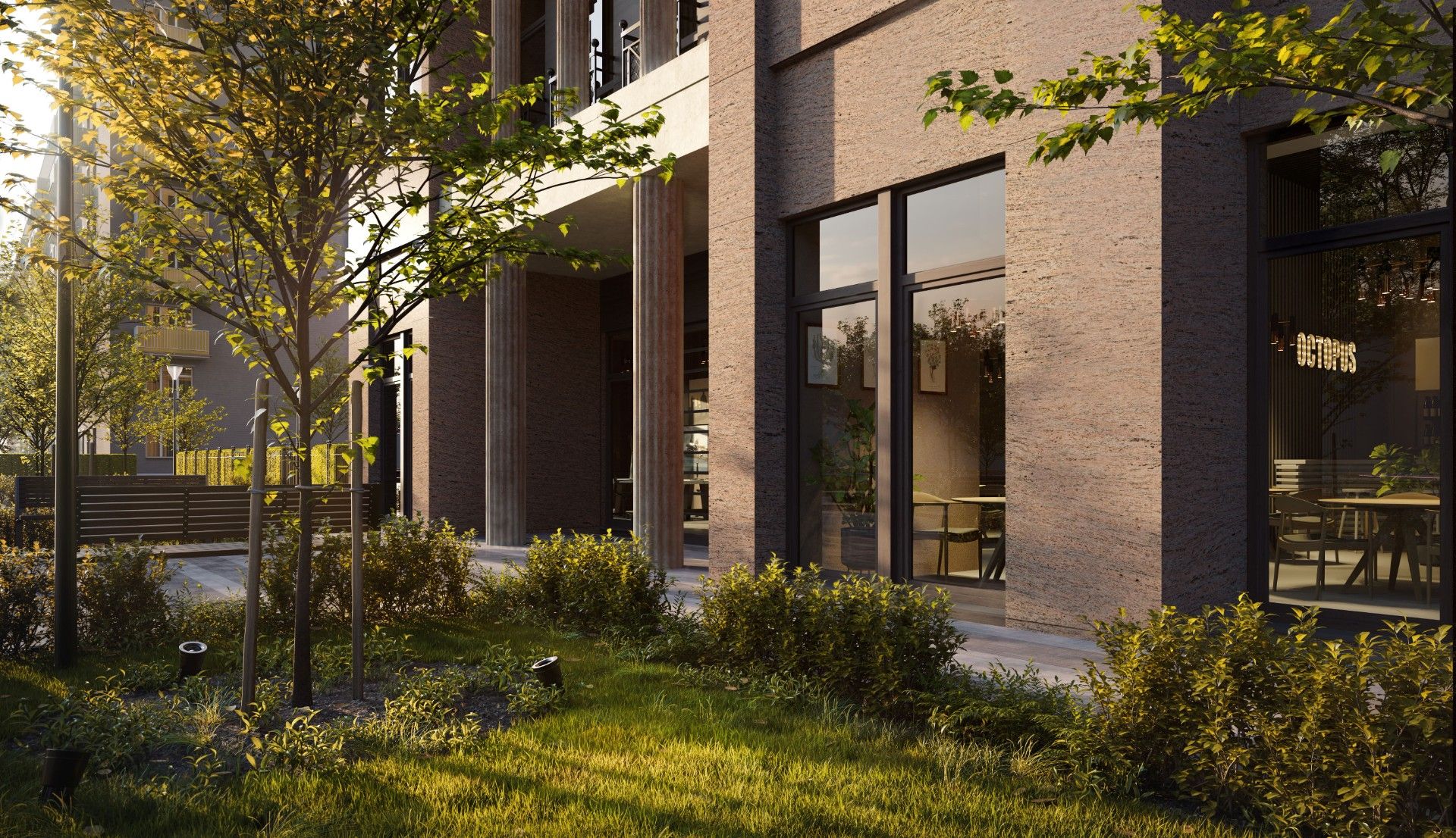Благоустройство и озеленение внутреннего двора будет выполнено по эксклюзивному ландшафтному проекту с детской площадкой и местами для отдыха и занятий спортом.