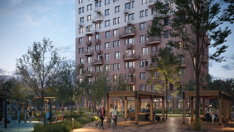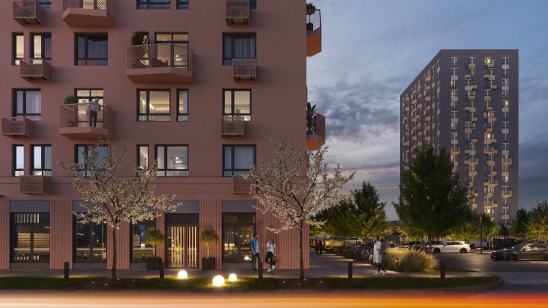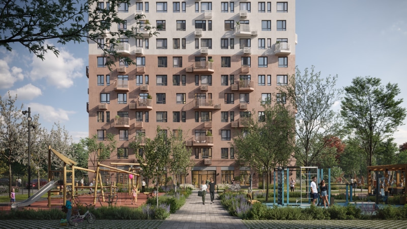 На придомовой территории появятся детская тематическая площадка с игровыми и развивающими объектами, воркаут-зона с тренажерами, лужайка для йоги, место для выгула собак и просторный прогулочный бульвар с кофейнями, скамейками и качелями.
