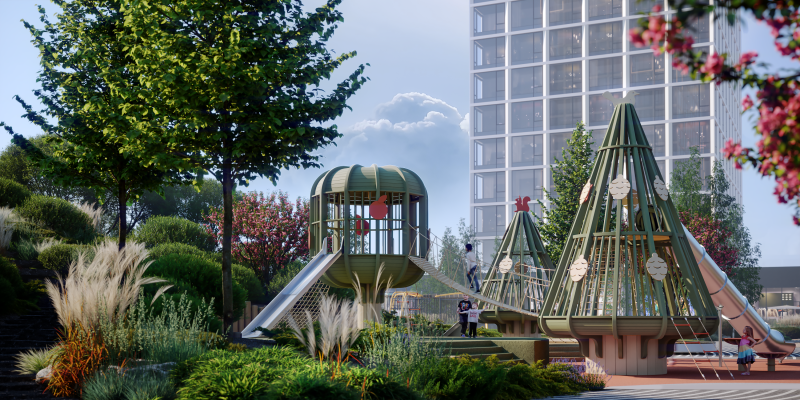 — Двухуровневый двор-парк 2 га с хвойным лесом и террасами