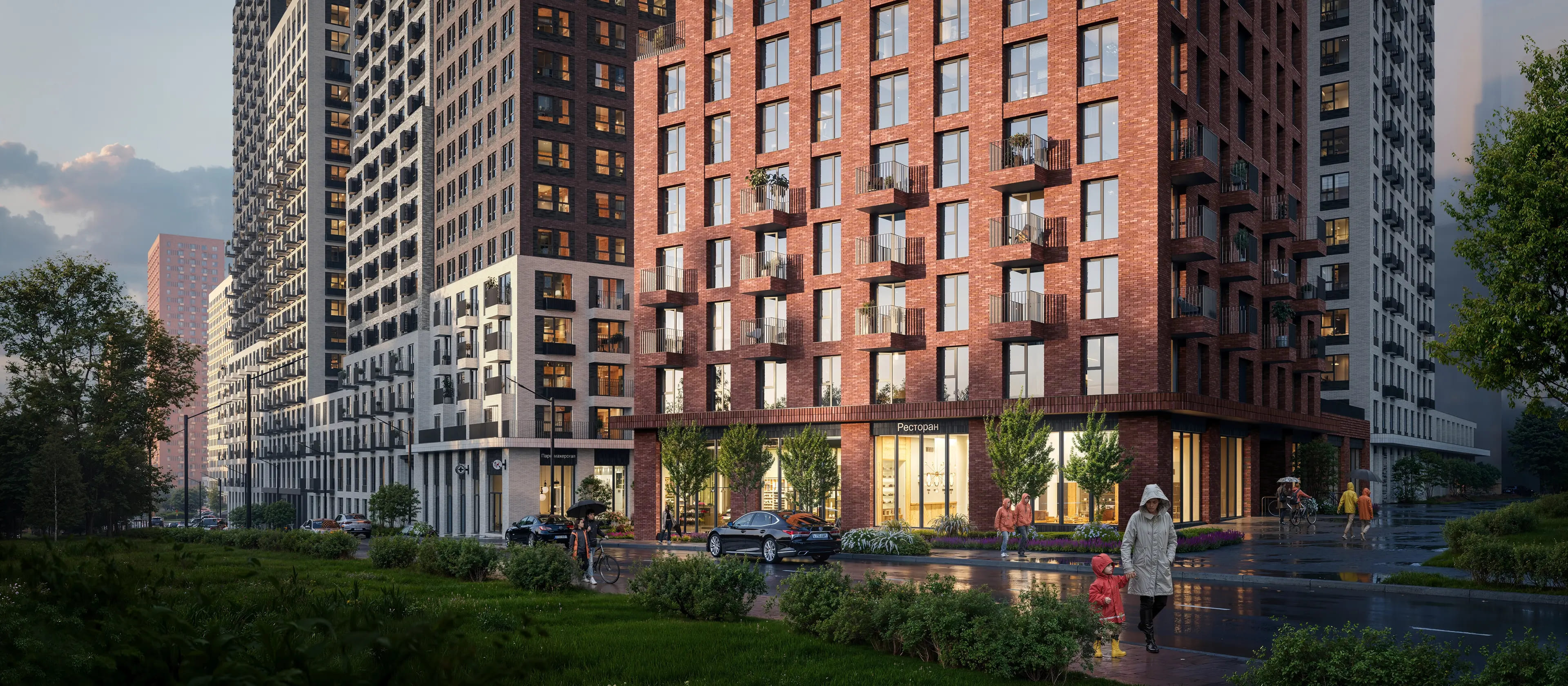 Концепция квартала сочетает эстетику и функциональность. Башня-доминанта цвета красной охры и разновысотные корпуса терракотового, белого и графитового оттенков формируют узнаваемый силуэт современного городского пространства. Просторные террасы, разнообразные балконы и окна в пол придают облику динамичность и дарят квартирам уютные места для отдыха.