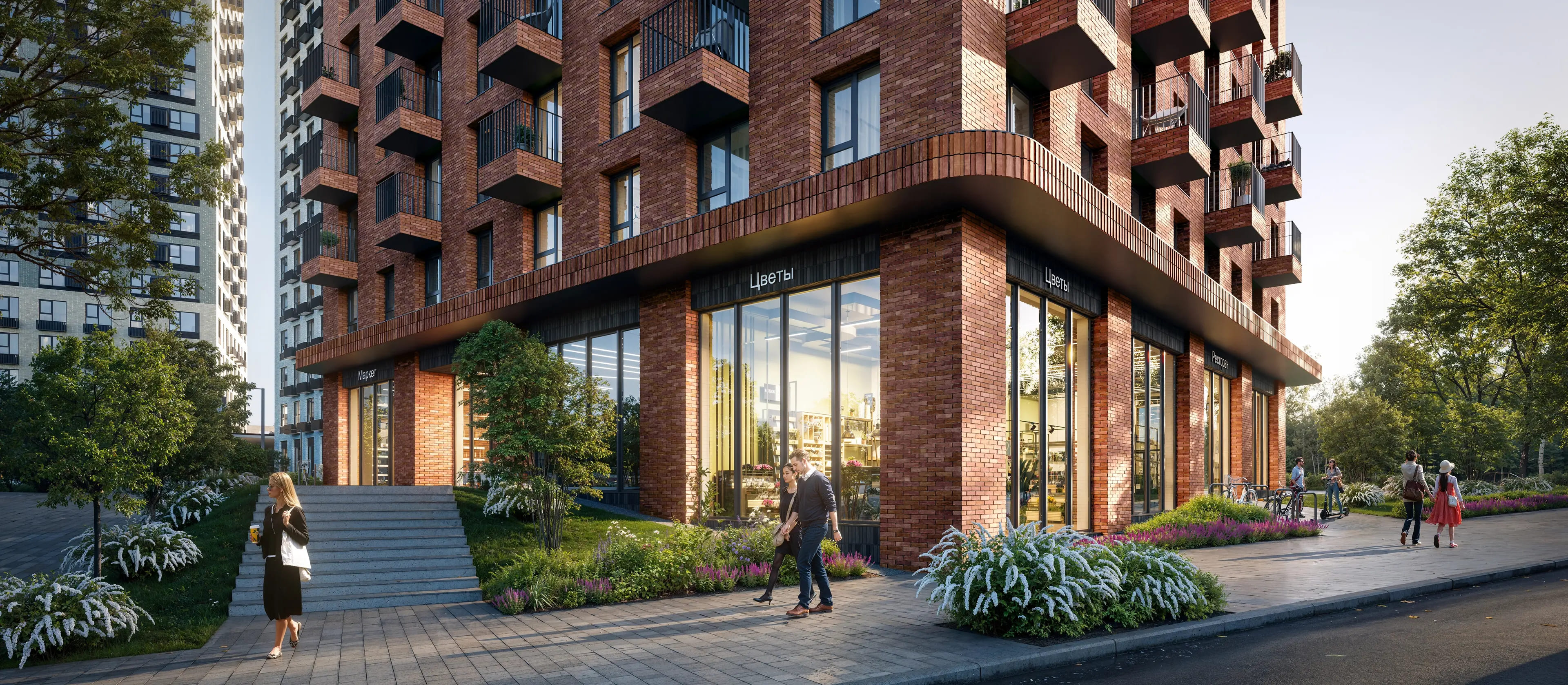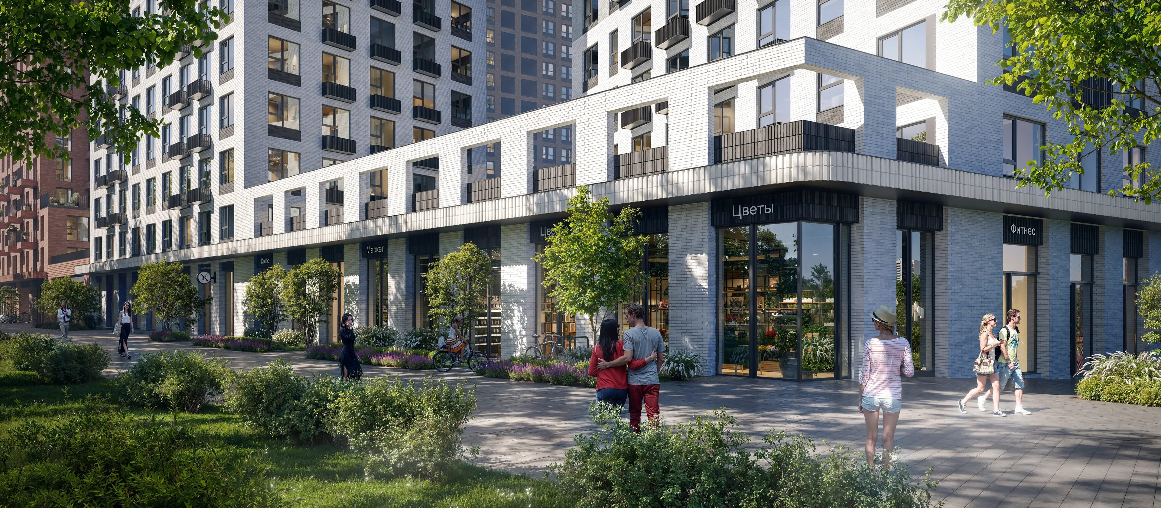 Первые этажи с панорамными окнами создают сцену для яркой городской жизни. Здесь появятся пространства для прогулок, летние террасы, рестораны и коммерческие помещения.