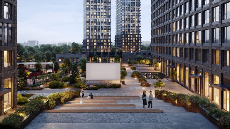 Приватные дворы NOVA закрыты от машин и посторонних. В безопасном пространстве дети будут знакомиться со сверстниками на игровых площадках, взрослые смогут расслабиться на удобных шезлонгах, потренироваться на спортивных площадках или пройтись с друзьями по пешеходному бульвару и мосту. Еще одним местом притяжения станет кинотеатр под открытым небом. Для владельцев собак предусмотрены современные догхабы.