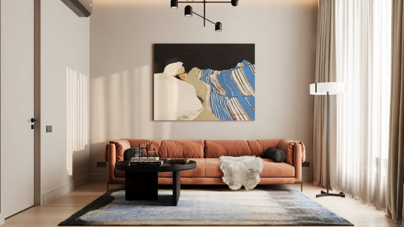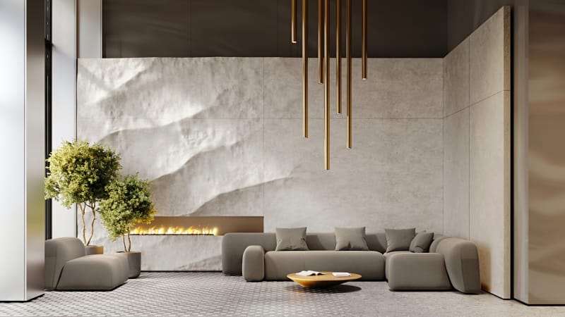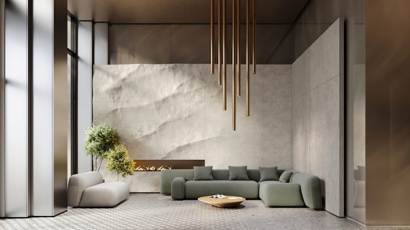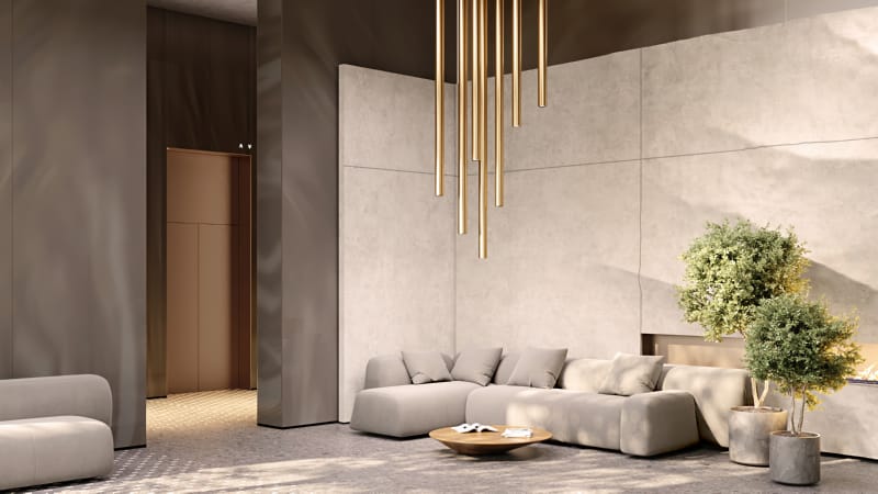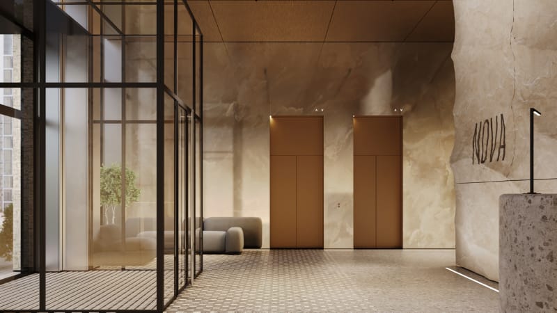В лобби — уютная лаунж-зона с камином, где можно подождать курьера или сделать паузу перед тем, как подняться домой. В отделке внутреннего пространства используются материалы природных оттенков: камень, стекло, металл и терраццо. Коляски и велосипеды можно оставлять в специальных помещениях на первом этаже. Для удобства владельцев собак предусмотрели лапомойки.