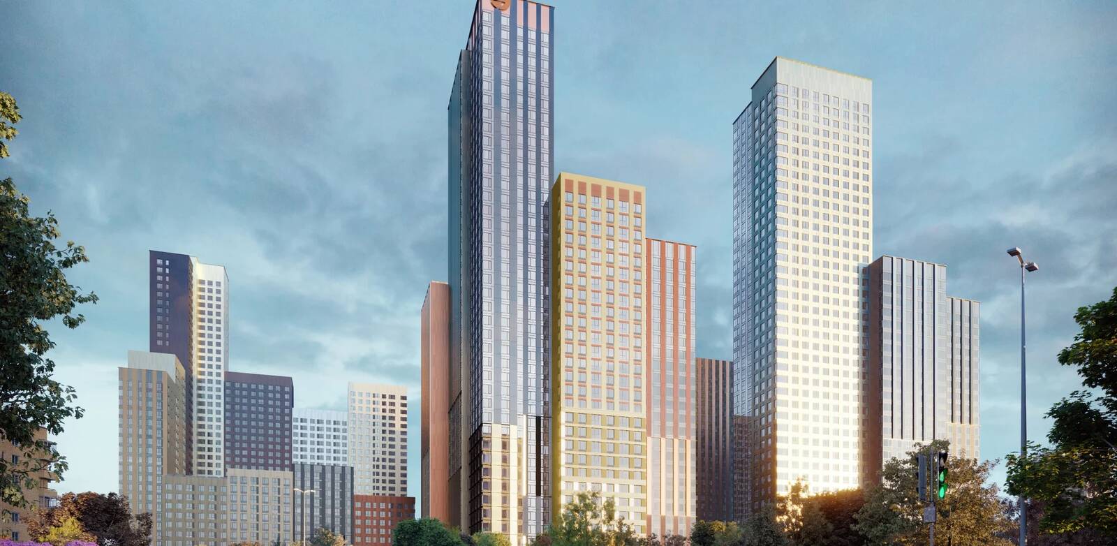 Фасады подчеркивают величие неба своими взмывающими вверх башнями с богатым теплым бронзовым отливом, из окон которых открываются невероятные виды на всю Москву. Собственный парк площадью 3,85 га с центральной площадью, декоративным прудом, сухим фонтаном, детскими и спортивными хабами создает ощущение, что Вы живете в природном оазисе.