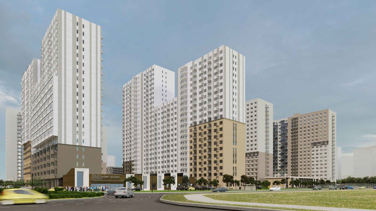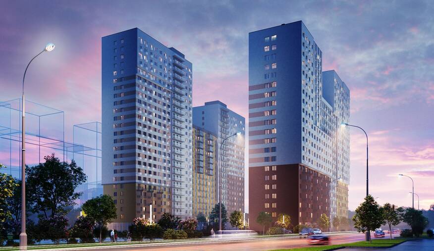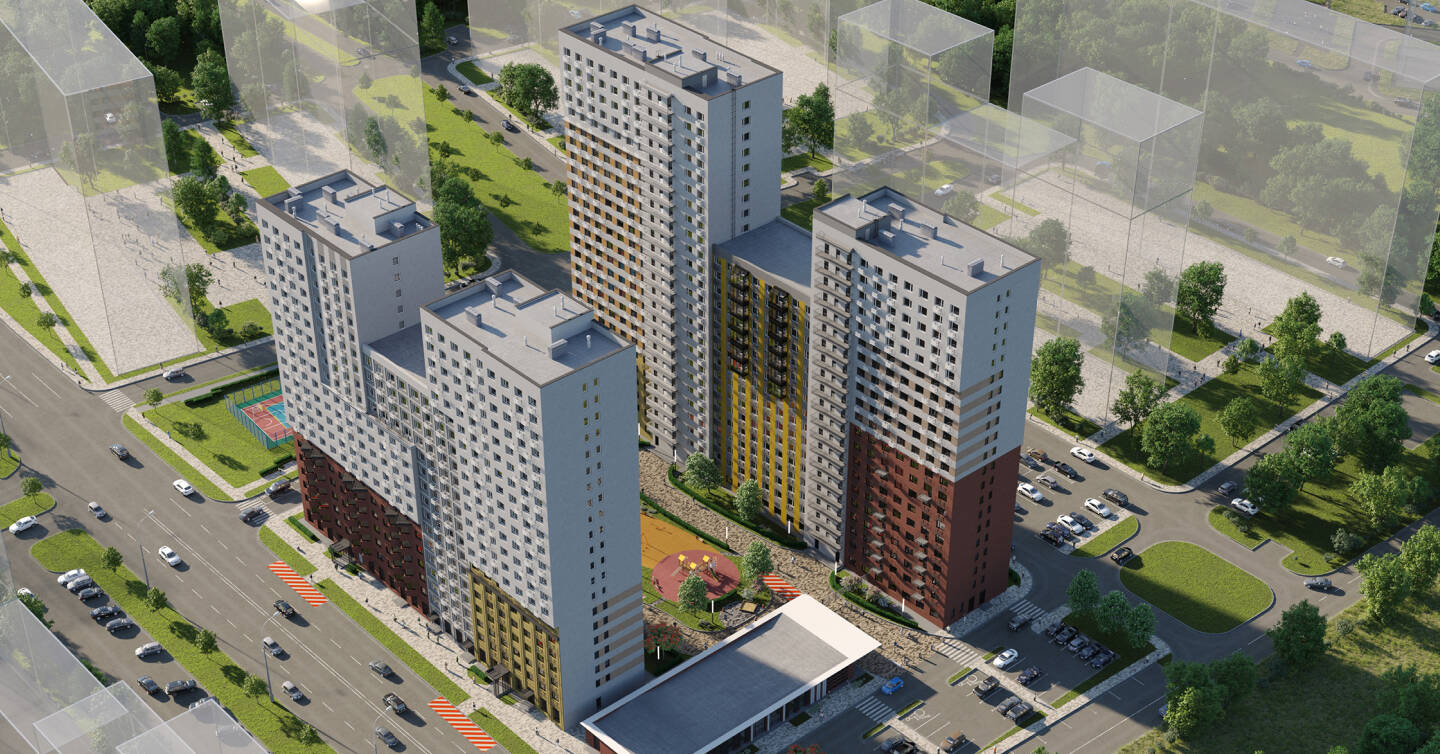 Многоэтажные дома, с открытыми внутренними дворами вписаны в общую зеленую зону и объединены с существующим ландшафтным окружением в единый природный комплекс. Пластика разноэтажной застройки (от пятнадцати до двадцати пяти этажей), с включением объемных разноуровневых элементов, создает ощущение плавного контура городской застройки и подчинена созданию образа многообразной и масштабной городской архитектуры.